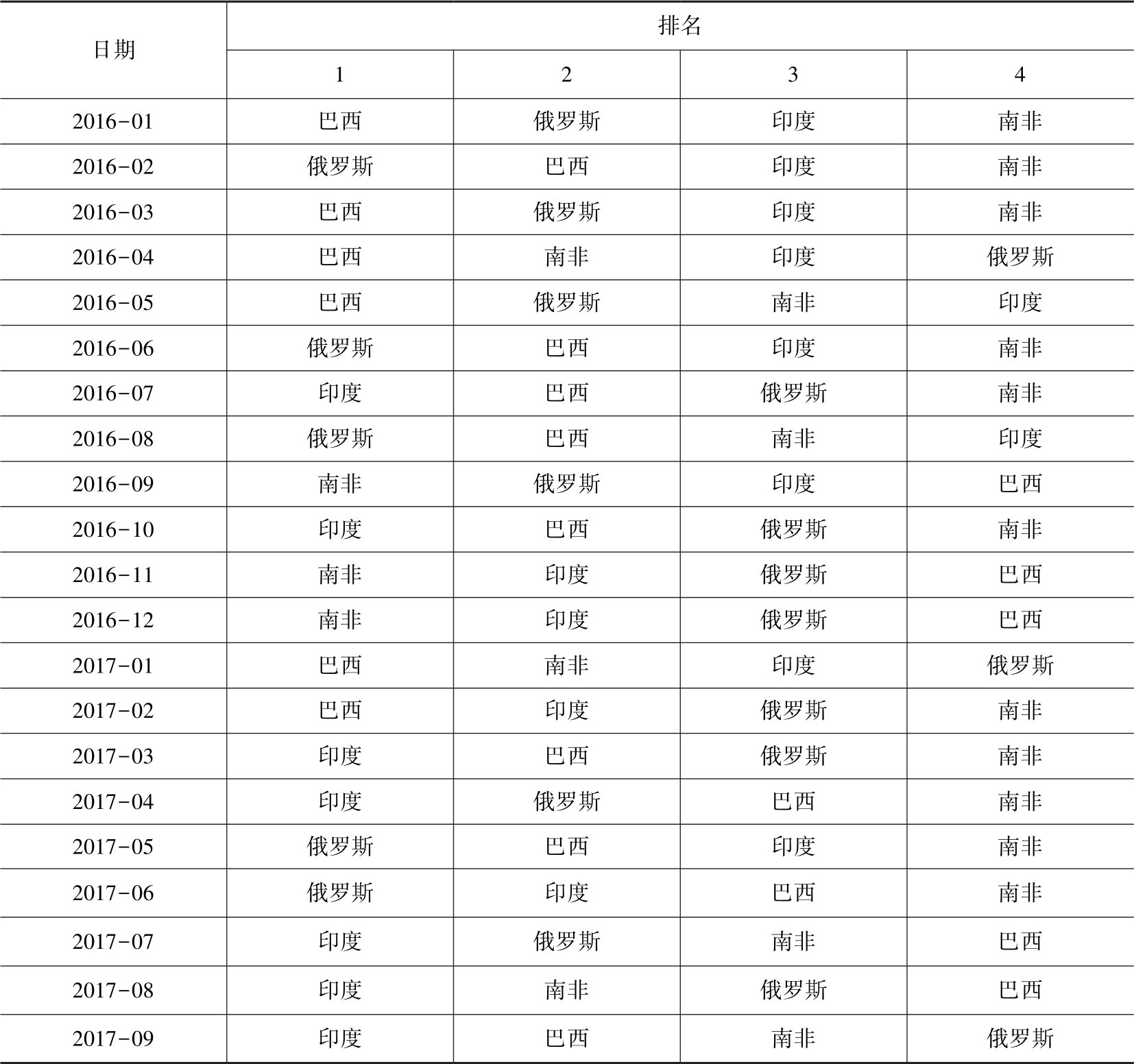 表2-3给出了2016年1月至2017年9月金砖各国的出口贸易活力指数排名。该表显示,各国的出口贸易活力指数排名分布具有显著变化。为了更好地显示2016年1月至2017年9月金砖各国出口贸易活力指数的变化,我们绘制了金砖国家出口贸易活力指数均值的条形图。图2-2显示,样本期间内金砖国家出口贸易活力指数均值的排名,从大到小依次为:俄罗斯、印度、南非与巴西。这进一步说明,中国向俄罗斯出口货物具有较强的成长能力。