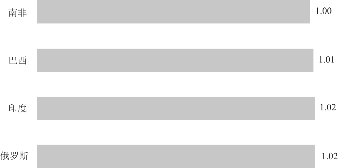 表3-7给出了2010—2016年金砖各国的进口贸易潜力指数排名。该表显示,各国的进口贸易潜力指数排名分布具有显著变化。为了更好地显示2010—2016年金砖各国进口贸易潜力指数的变化,我们绘制了金砖国家进口贸易潜力指数均值的条形图。图3-4显示,样本期间内金砖国家进口贸易潜力指数均值的排名,从小到大依次为:南非、巴西、印度与俄罗斯。这进一步说明,中国从南非进口货物具有较强的增长潜力。