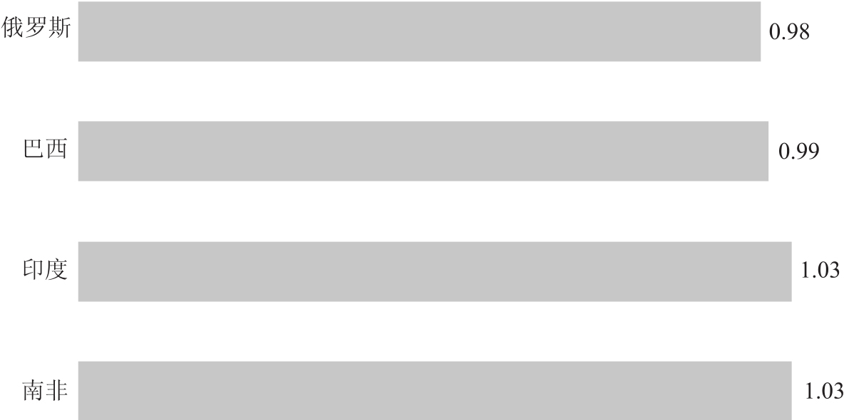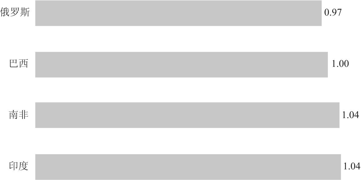 表3-3给出了2010—2016年金砖各国的贸易潜力指数排名。该表显示,各国的贸易潜力指数排名分布具有显著变化。为了更好地显示2010—2016年金砖各国贸易潜力指数的变化,我们绘制了金砖国家贸易潜力指数均值的条形图。图3-2显示,样本期间内金砖国家贸易潜力指数均值的排名,从小到大依次为:俄罗斯、巴西、印度与南非。这进一步说明,中国与俄罗斯的双边贸易具有较强的增长潜力。