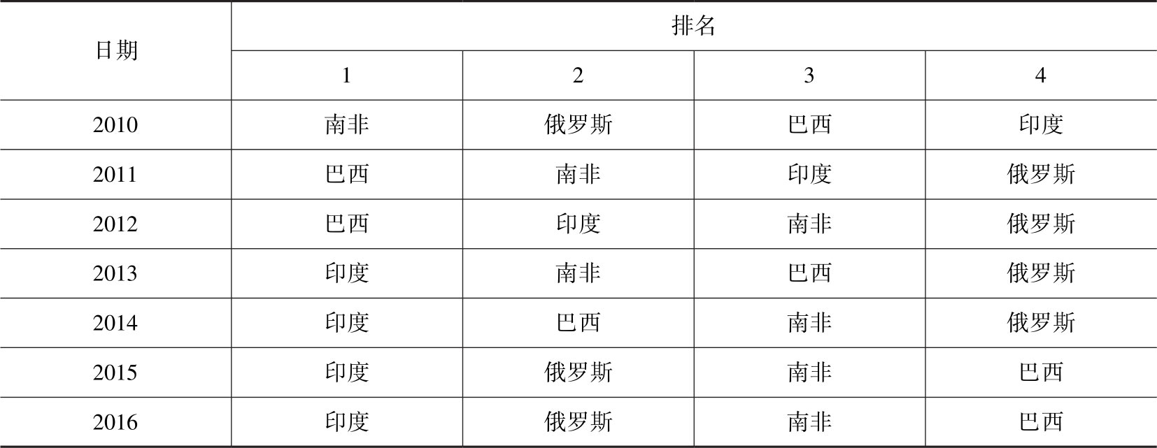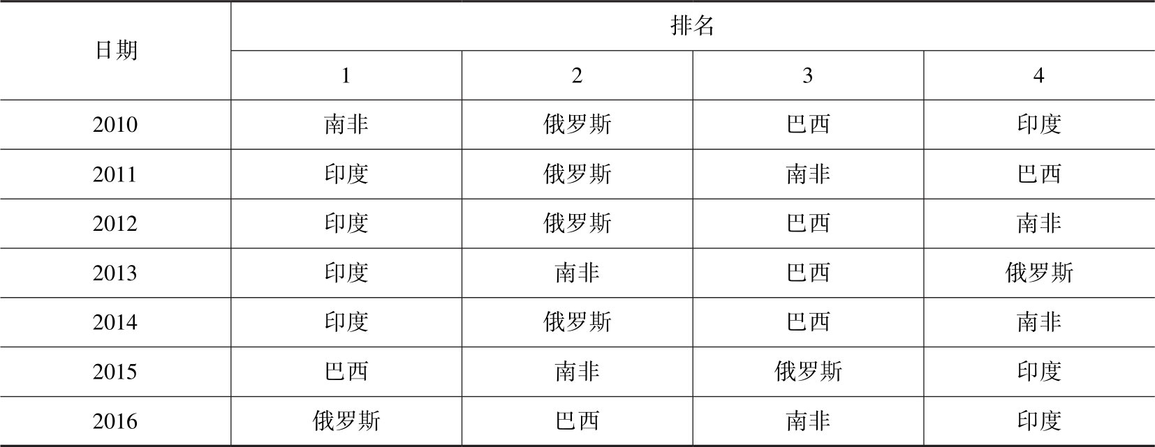 在金砖国家贸易潜力指数构建框架的基础上,利用2010—2016年的年度数据,采用引力模型,测算出2010—2016年中国与其他金砖各国的出口贸易潜力指数(ETP)。此外,需要注意的是,数值越小,排名越靠前,中国向该国家出口的贸易潜力越大。