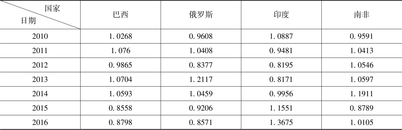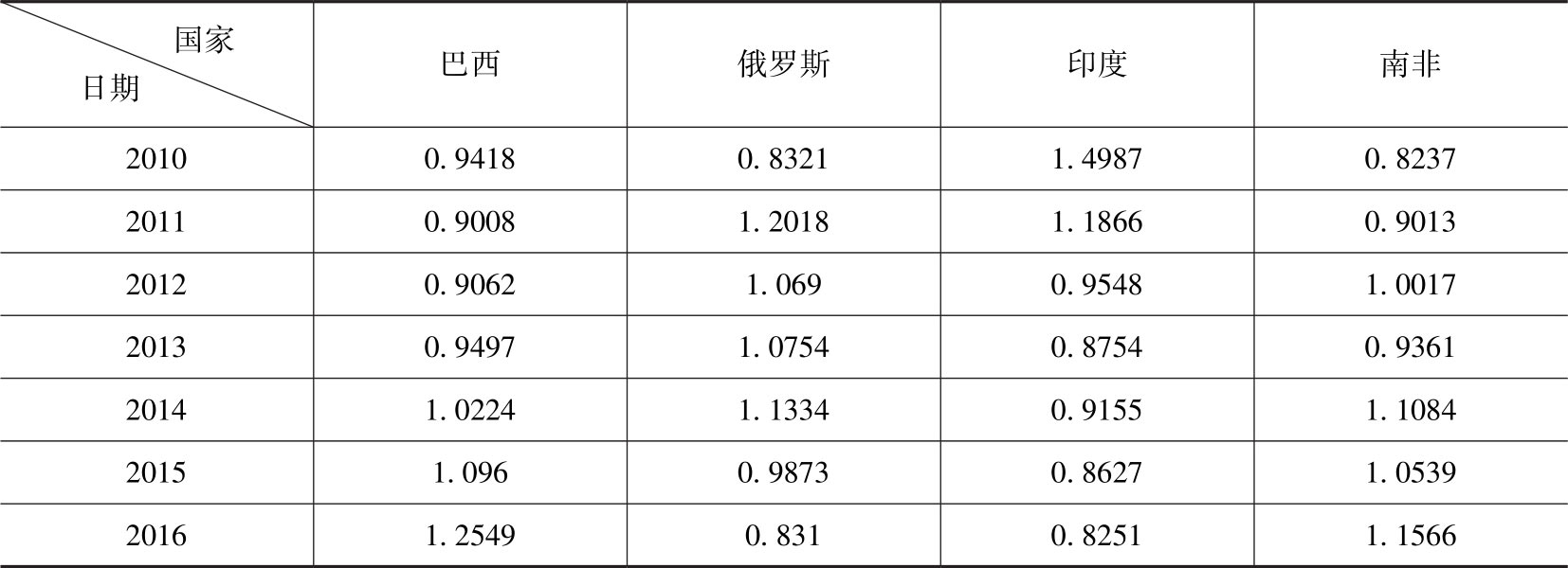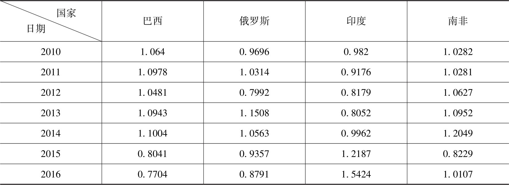 表3-2显示了2010—2016年中国与其他金砖各国的贸易潜力指数(BTPI),整体而言,金砖各国的指数值均在1左右,彼此差距较小。对于中国而言,这些金砖国家属于潜力开拓性国家,中国与这些国家进行双边贸易时,双边进出口增长的空间有限,双方应着力于挖掘新的贸易增长点,同时积极维护原有的积极关系,以使得双边贸易在未来能持续发展。