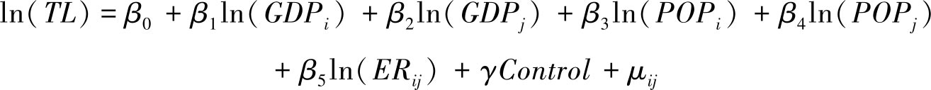 其中, TL 表示因变量,包括 TR 、 X 和 M ,分别表示中国与其他金砖各国的贸易总额(万美元)、中国对其他金砖各国的出口价值(万美元)、中国从其他金砖各国的进口价值(万美元)。 GDP i 表示中国的国内生产总值, GDP j 表示其他金砖各国的国内生产总值, POP i 表示中国的人口总数, POP j 表示其他金砖各国的人口总数, ER ij 表示用其他金砖各国货币标价的人民币汇率。 Control 表示控制变量,包括 D ij , LD j , S i 和 TR j ,分别表示两国的绝对距离;是否为内陆国,是取1,否取0;“一带一路”虚拟变量,2013年第3季度及之后取1,之前取0;是否加入世贸组织,是取1,否取0。