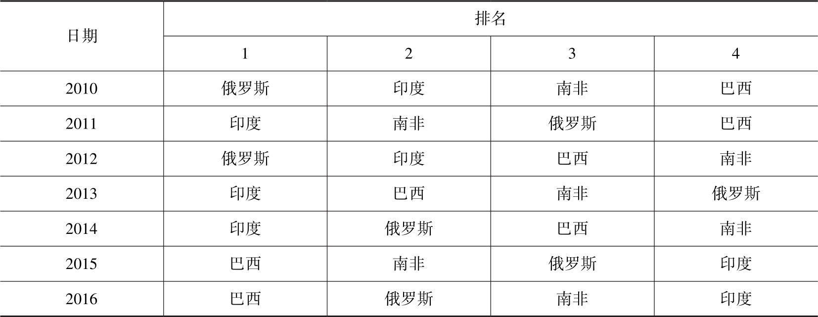 表3-3 金砖国家贸易潜力指数排名分布情况