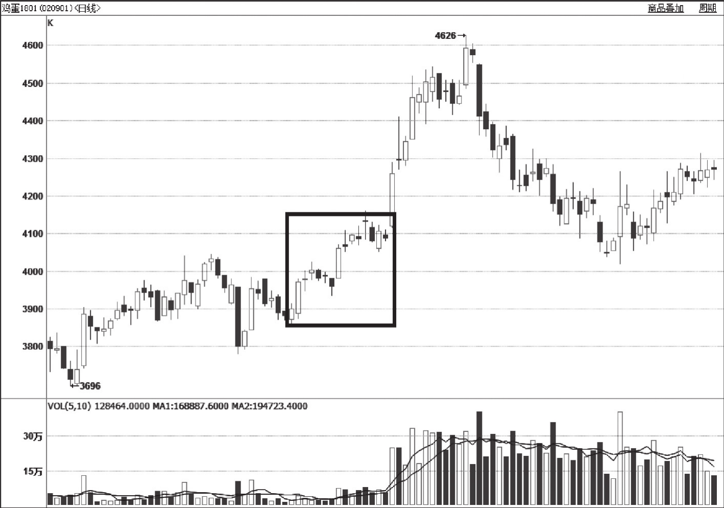 在图2-28中,鸡蛋1801合约2017年7月价格经过短线的调整之后继续上涨。只要方向不是下降的,就应当密切留意收出的那些实体较大的阳K线,因为这些K线往往会向投资者透露出支撑与促涨的信号。