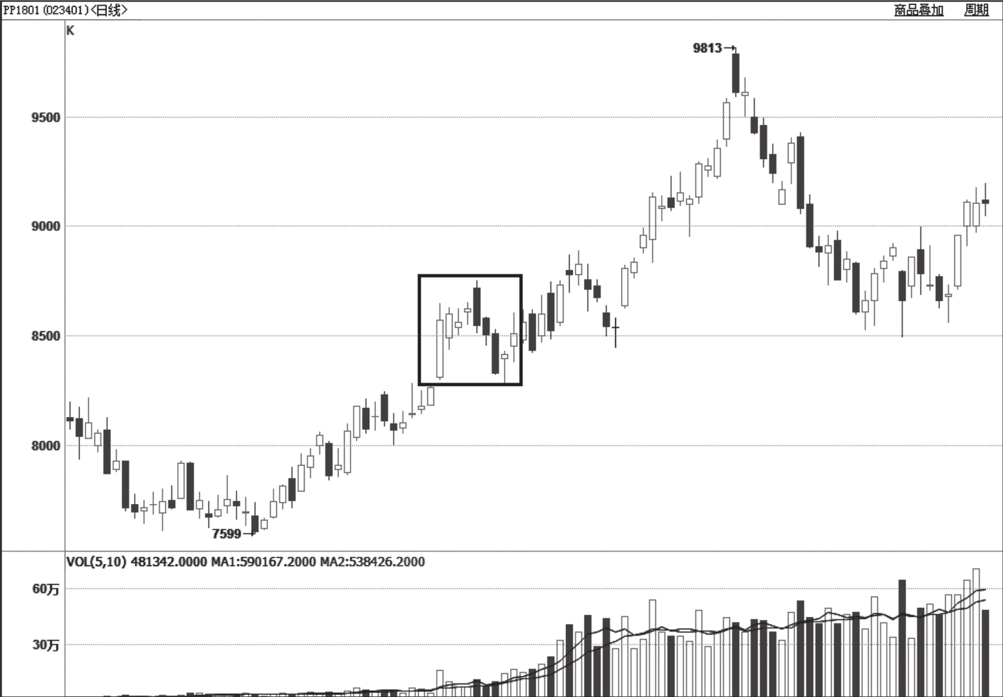 在图2-27中,PP1801合约2017年7月价格见底之后形成了一波持续上涨的行情,在上涨的过程中,价格的波动形态并不复杂,操作的难度不是很大。在价格上涨或下跌意愿强烈的时候,其形态往往都比较简单。但凡碰到不愿意连续涨跌的走势时,行情的变化就会非常复杂,例如横盘区间。