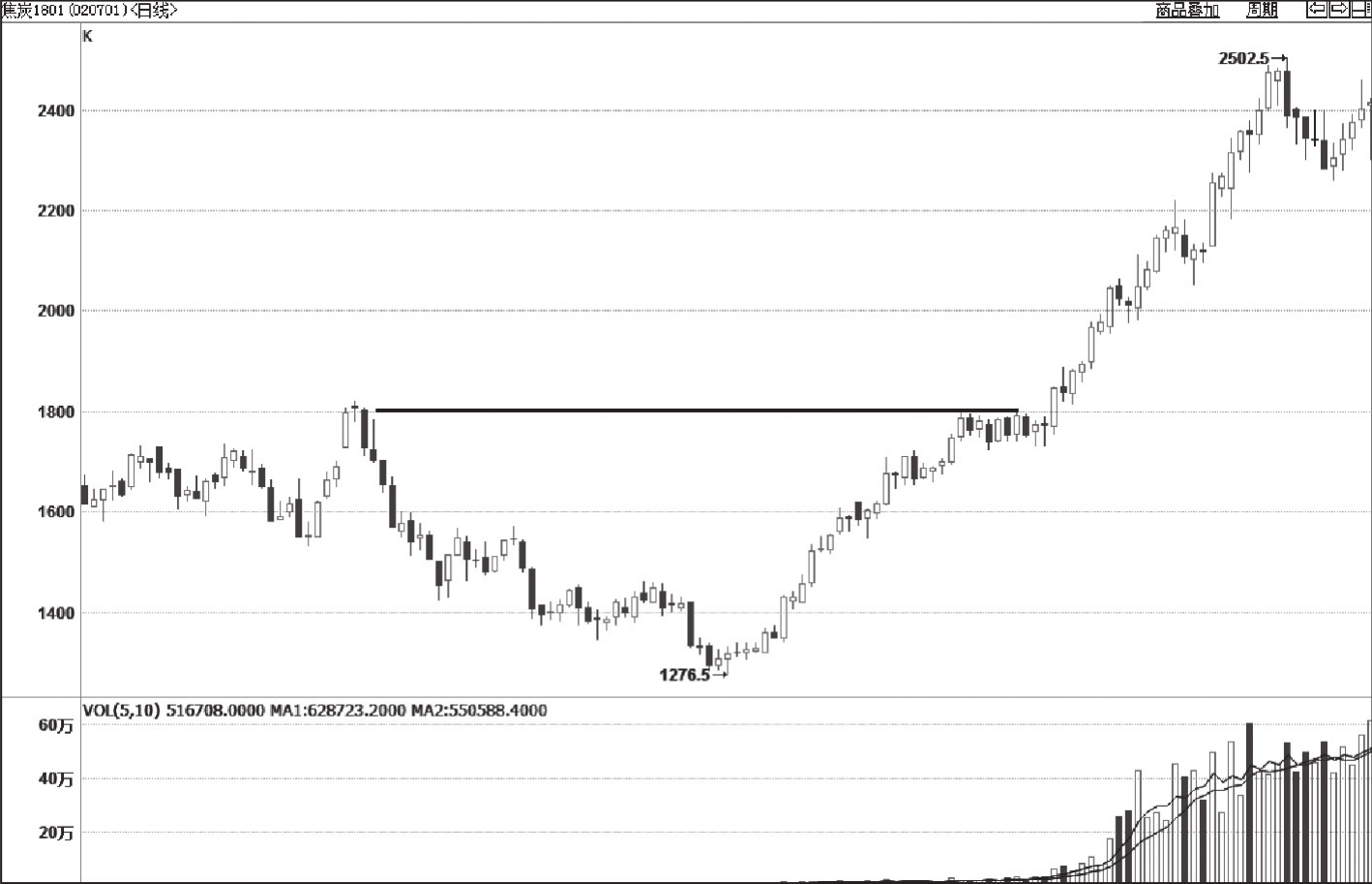在图2-30中,焦炭1801合约2017年7月价格见底之后进入了又一轮的牛市上涨行情,价格从低点一口气上涨到前期的高点附近。虽然后期成功地突破了前高点,但也在突破前主动低了低头。是什么原因导致价格在这个位置出现回落呢?