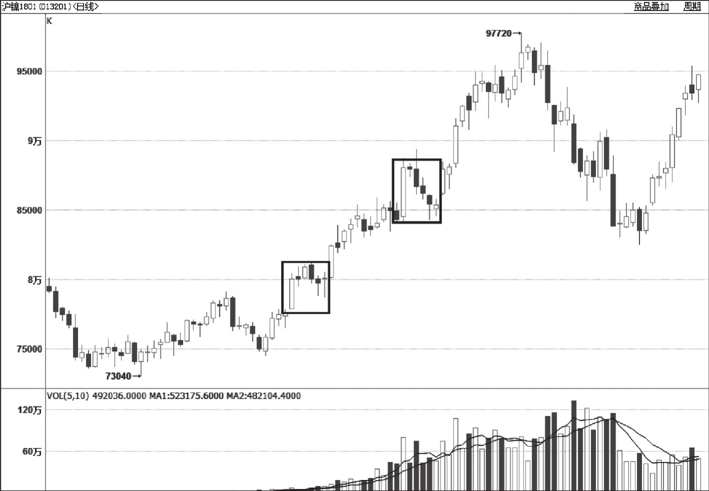在图2-26中,沪镍1801合约2017年8月价格已步入明确的上升趋势中,在上涨的过程中必然会见到实体较大的阳线,而一旦遇见这些大实体的阳线就一定要习惯性地将它们作为近期的一个重要参照。若价格继续上涨,大阳线会对上涨起到促进作用,若价格调整,这些大实体的阳线则会发挥强大的支撑作用。
