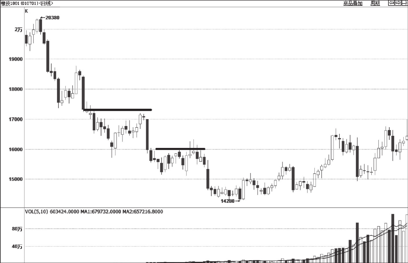 在图2-29中,橡胶1801合约2017年4月价格见顶之后出现了连续回落的走势,在下跌的过程中收出了多根大实体的阴线,一次又一次宣示着空方牢牢把控局面。阳线实体小而阴线实体普遍较大,面对这种整体K线形态,必须要服从方向坚定做空。