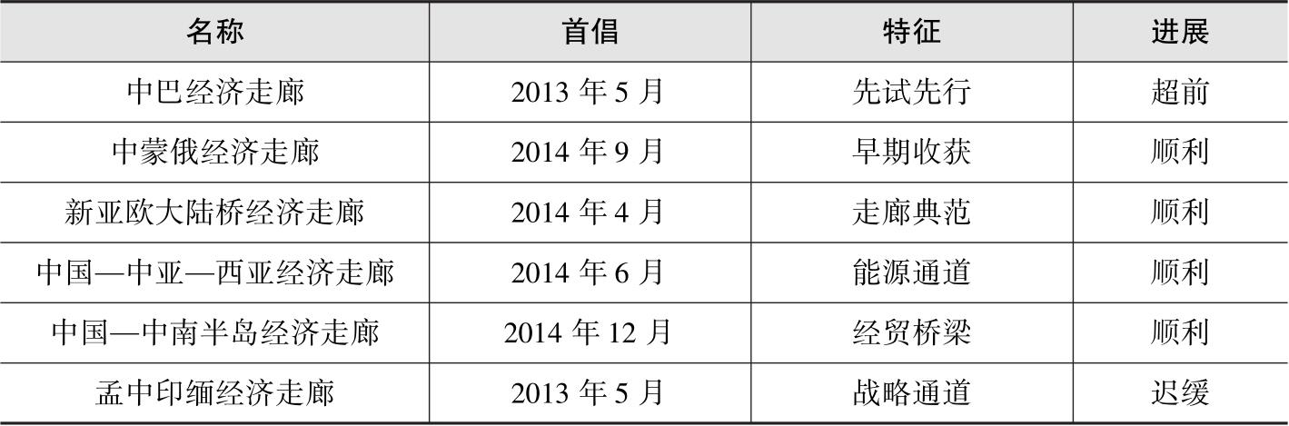 2013年,习近平主席提出共建丝绸之路经济带和21世纪海上丝绸之路重大倡议。2015年,中国政府发布《推动共建丝绸之路经济带和21世纪海上丝绸之路的愿景与行动》(以下简称《愿景与行动》),提出以政策沟通、设施联通、贸易畅通、资金融通、民心相通为主要内容,坚持共商、共建、共享原则,积极推动“一带一路”建设。倡议提出至今,得到了国际社会的广泛关注和积极回应,目前已有100多个国家和地区及国际组织积极支持和参与“一带一路”建设,我国已经与60多个国家和地区及国际组织签署了“一带一路”合作协议。同时,亚洲基础设施投资银行正式开业,丝路基金已经设立,“一带一路”建设工作领导小组业已成立,《愿景与行动》正在推进,“一带一路”国际合作高峰论坛成功召开。随着六大经济走廊的规划或筹建,“一带一路”建设进入了全面推进阶段。就目前六大经济走廊建设进展而言,发展程度和特征各有不同(见表1)。