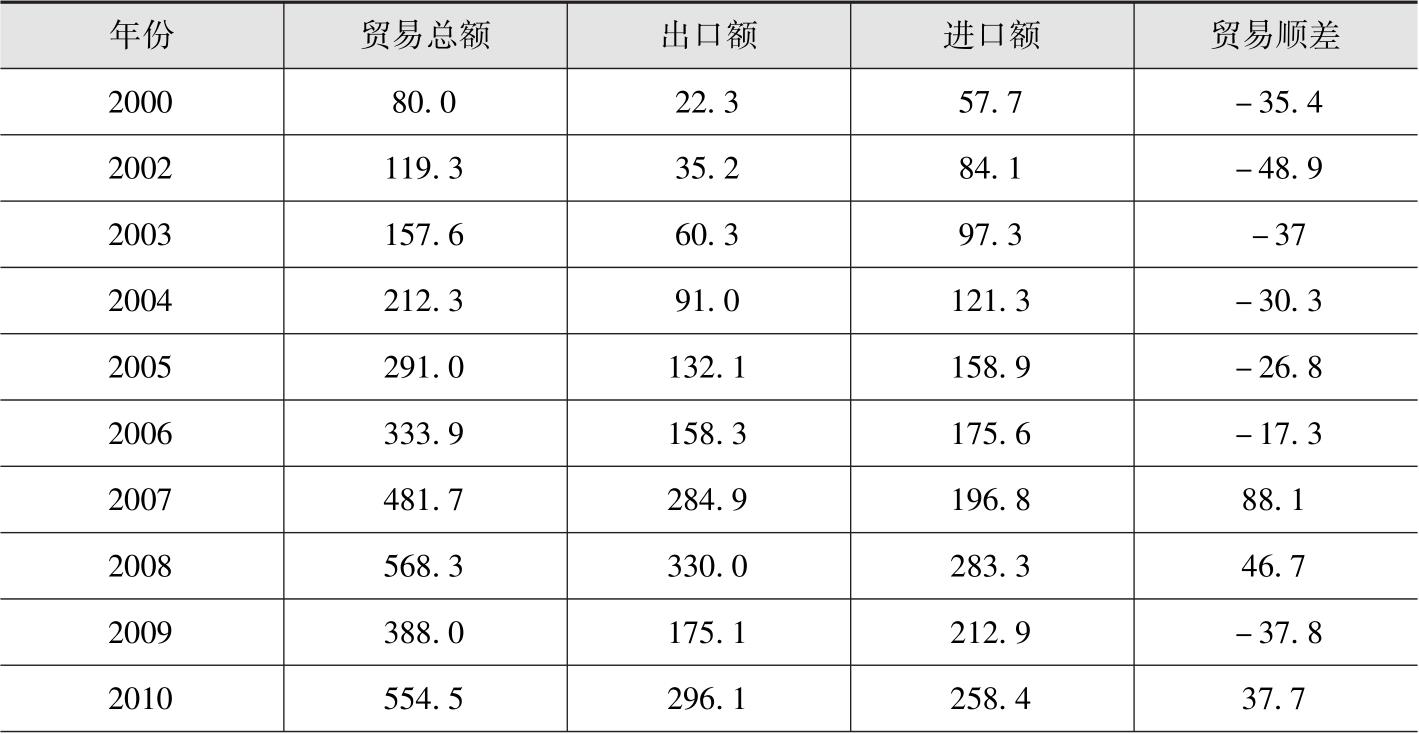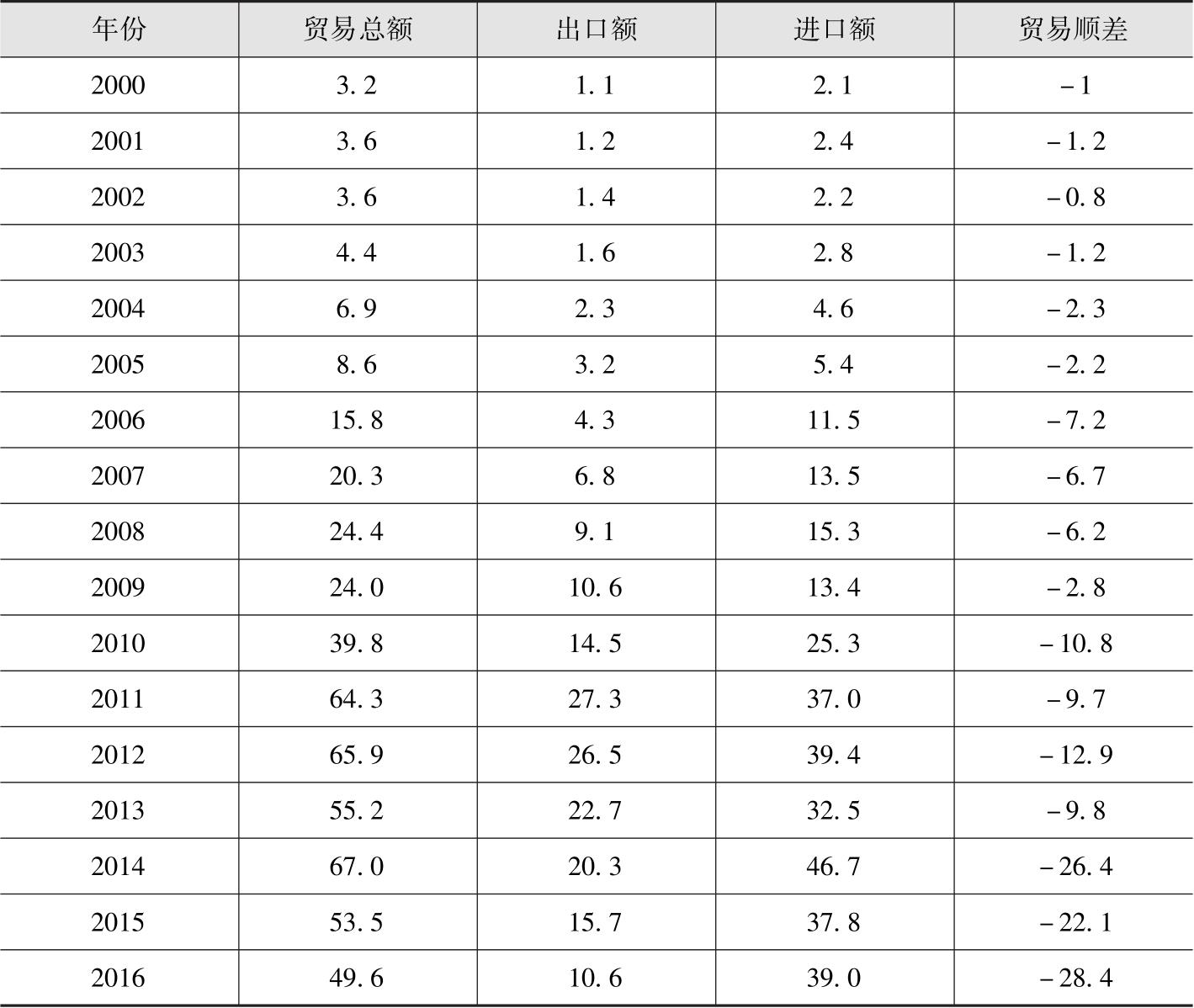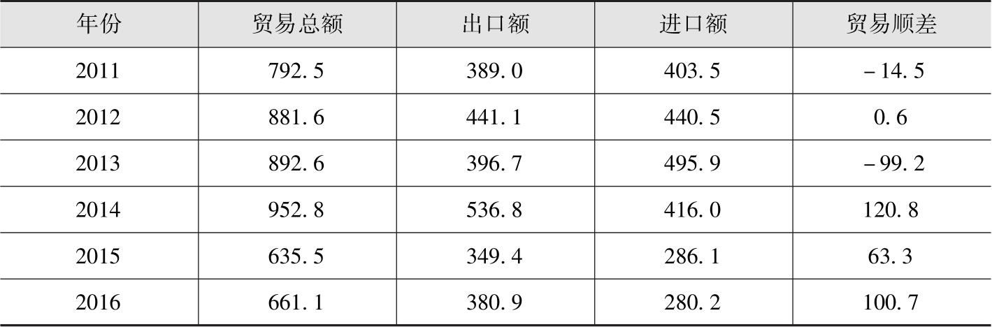 表1-1 2000—2016年中国对蒙古国贸易情况 单位:亿美元