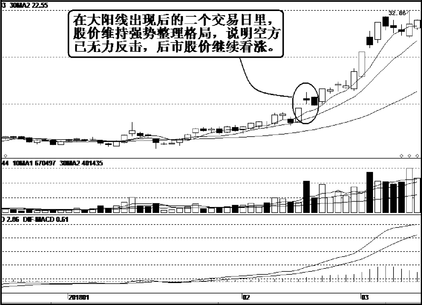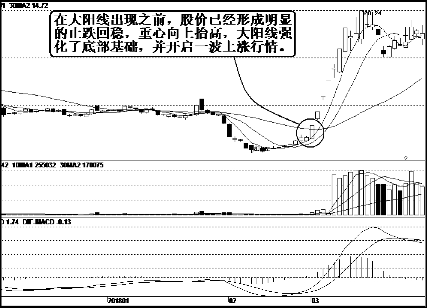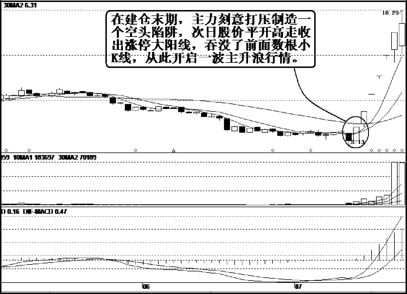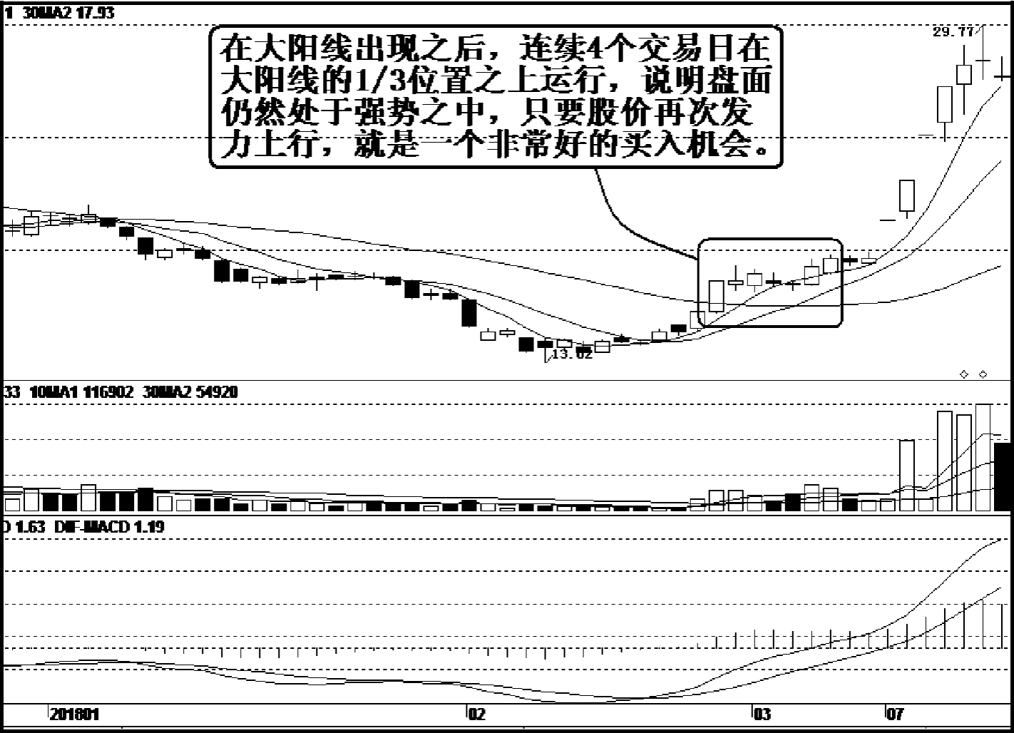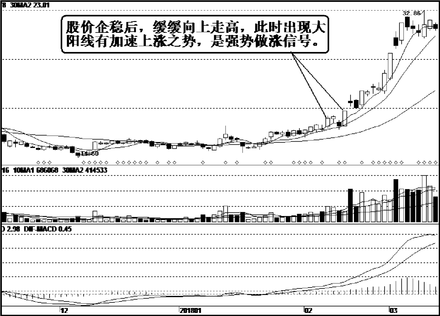 (2)在大阳线出现之前,股价已经明显见底,市场处于强势之中,均线系统呈现多头排列,30日均线呈现上行走势。在大阳线出现之后,均线系统要进一步呈现多头发散,以继续支持股价上涨。