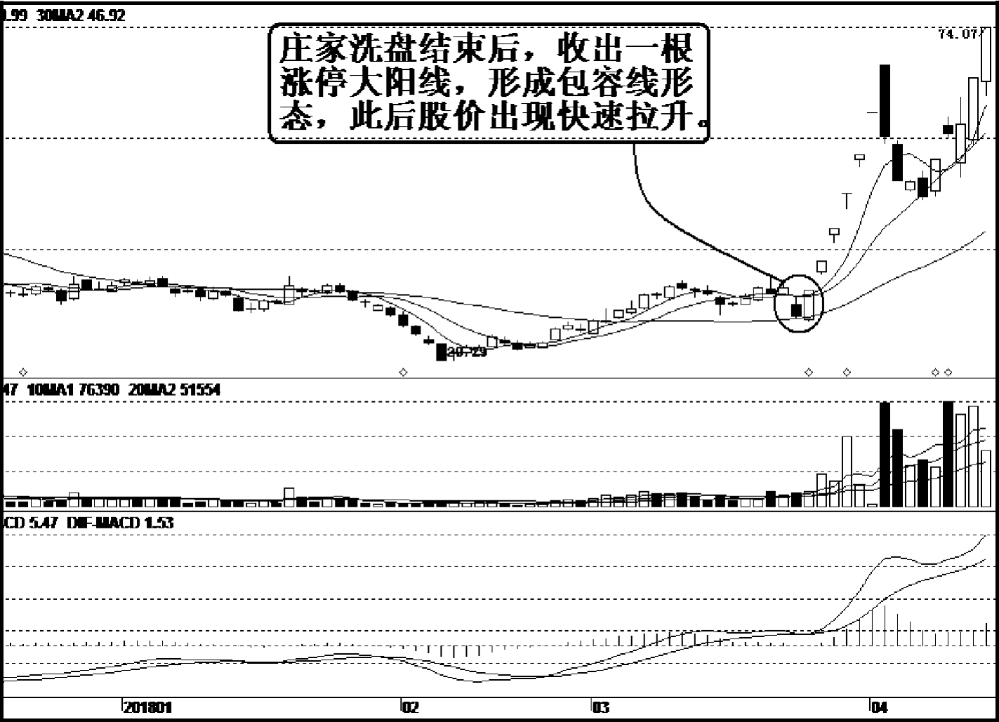 图2-42,必创科技(300667):股价见底后步入盘升行情,庄家采用边拉升、边洗盘、边整理的方式将股价不断推高,当股价回升到前期盘区附近时,庄家主动展开洗盘整理走势。2018年3月23日,一根接近跌停的大阴线向下击穿了整理小平台,而第二天一根涨停的大阳线向上拉起,收复了前一天阴线的全部失地,形成“阳包容”形态,成交量也开始明显放大,说明洗盘整理结束,从此股价出现飙升行情。
