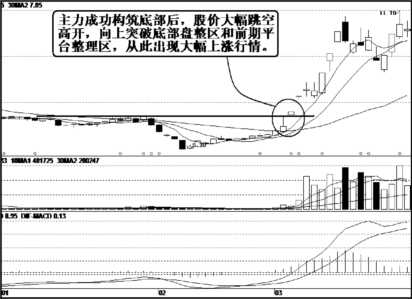 (2)当股价成功筑底后,往往会展开横盘走势。若股价突破近期阻力位时,突然拉出一根大阳线,并伴随天量的出现,则表明增量资金进场积极,股价将攻击上方均线阻力位,因而是一个启动信号。