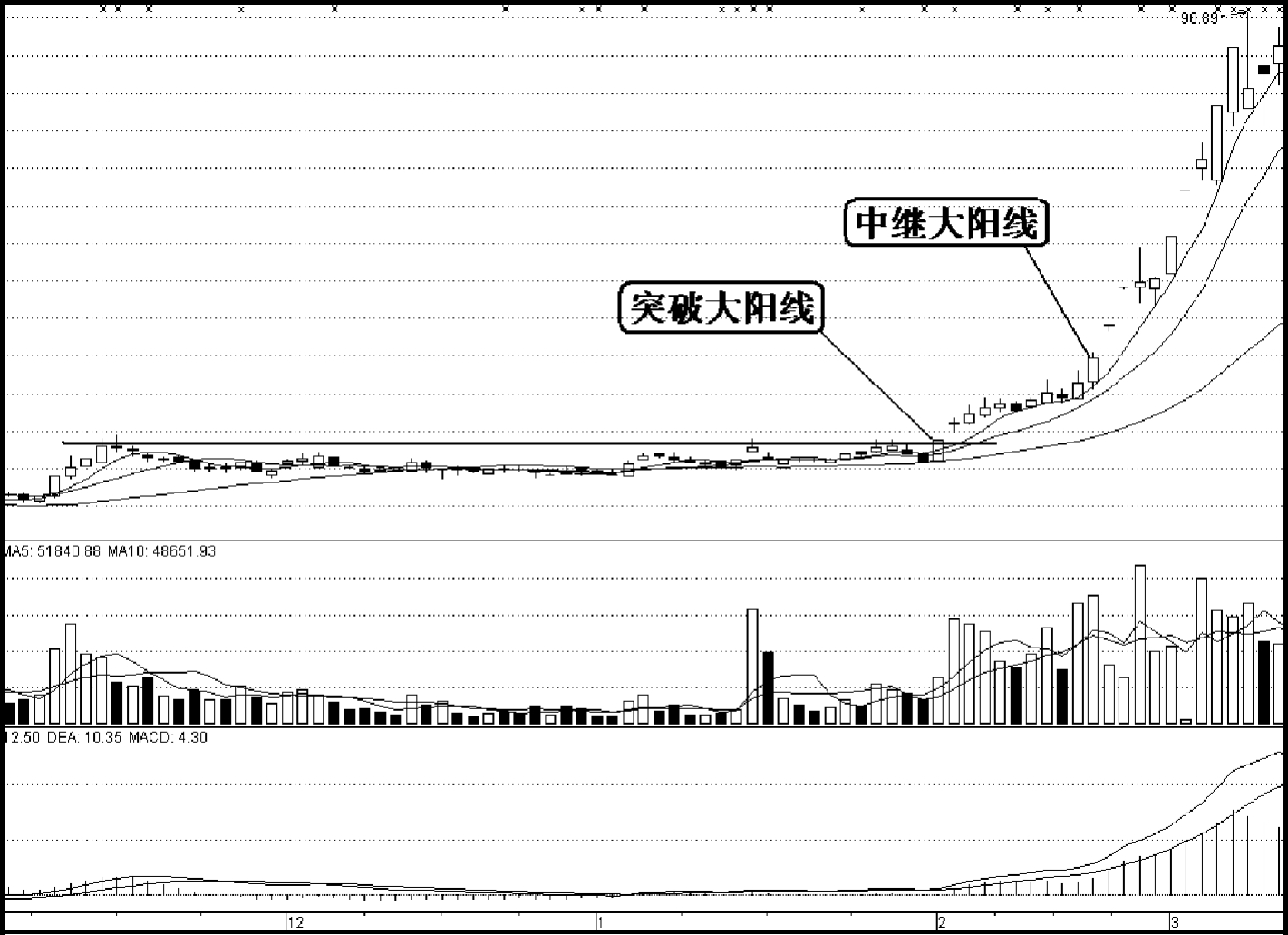 (3)若股价一旦攻击阻力位成功,往往会依托这根均线再次展开横盘走势,以清除近期低位跟进的筹码。一旦清除完毕,股价将进入上升行情之中,当股价涨升一段时间后,若再次出现一根大阳线,并伴随天量出现,则表明庄家拉升心切,要加速推高股价,因而是一个上涨中继信号。