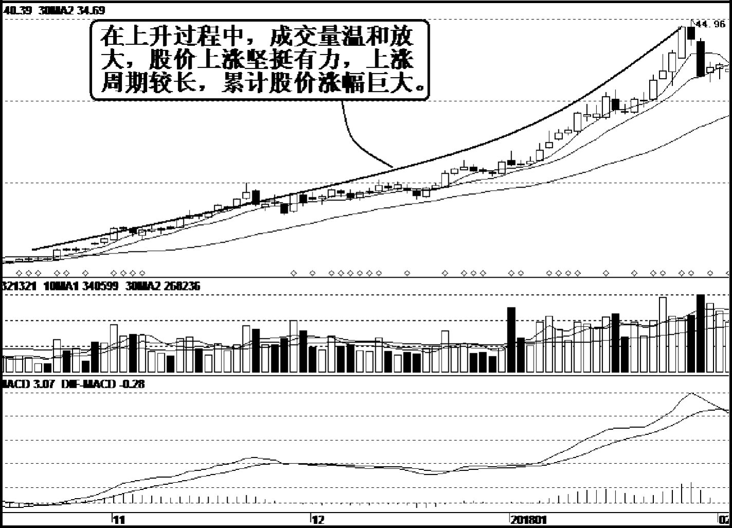 图2-49,新城控股(601155):该股上市以后就被实力强大的庄家看中,成功探明底部后,不断有大资金介入。在底部的两波上涨行情中,成交量都出现温和放量态势,表明资金有计划地入市,盘面张弛有序,上涨周期较长,走势如行云流水,股价飘带式上行,这期间出现的大阳线都是非常强势的上涨信号。该股从2017年9月开始出现加速上涨,到2018年1月股价累计涨幅超过6倍。
