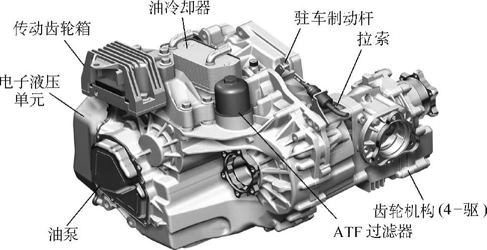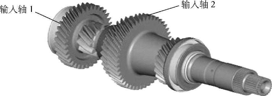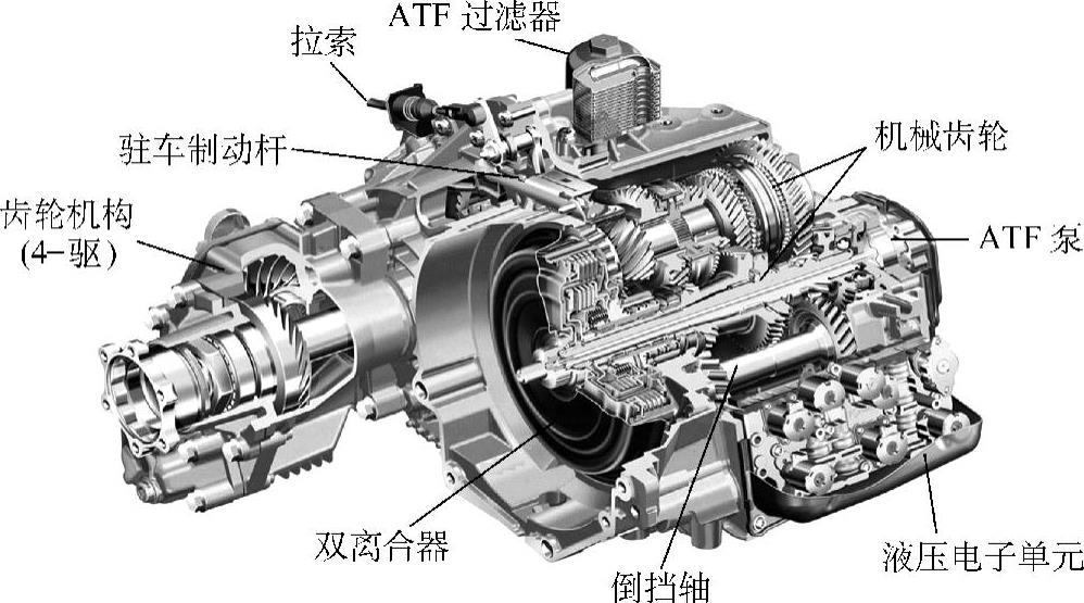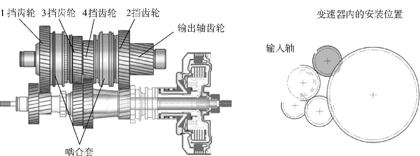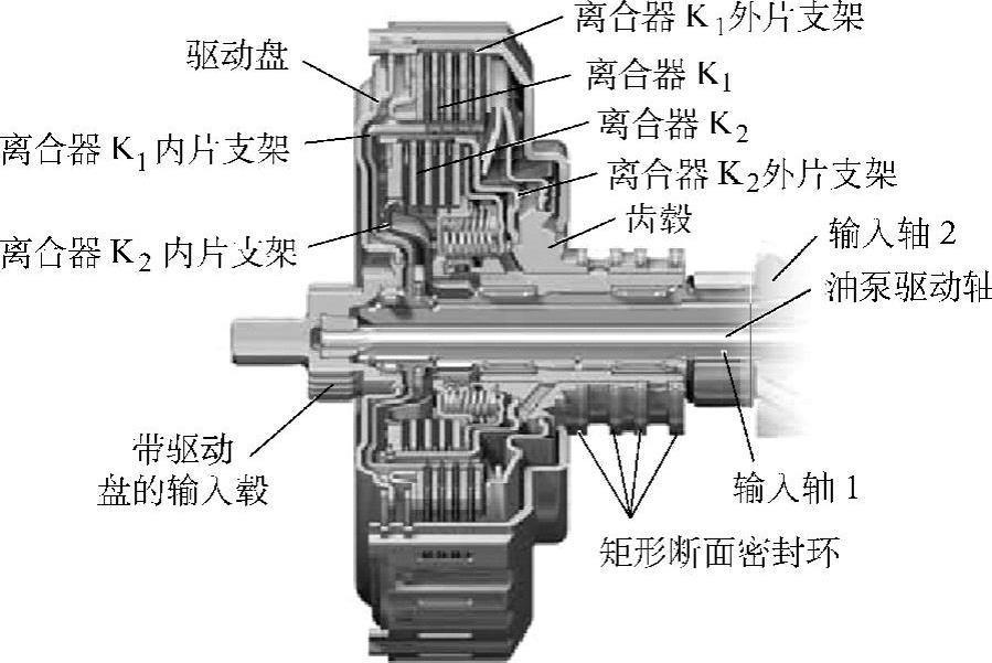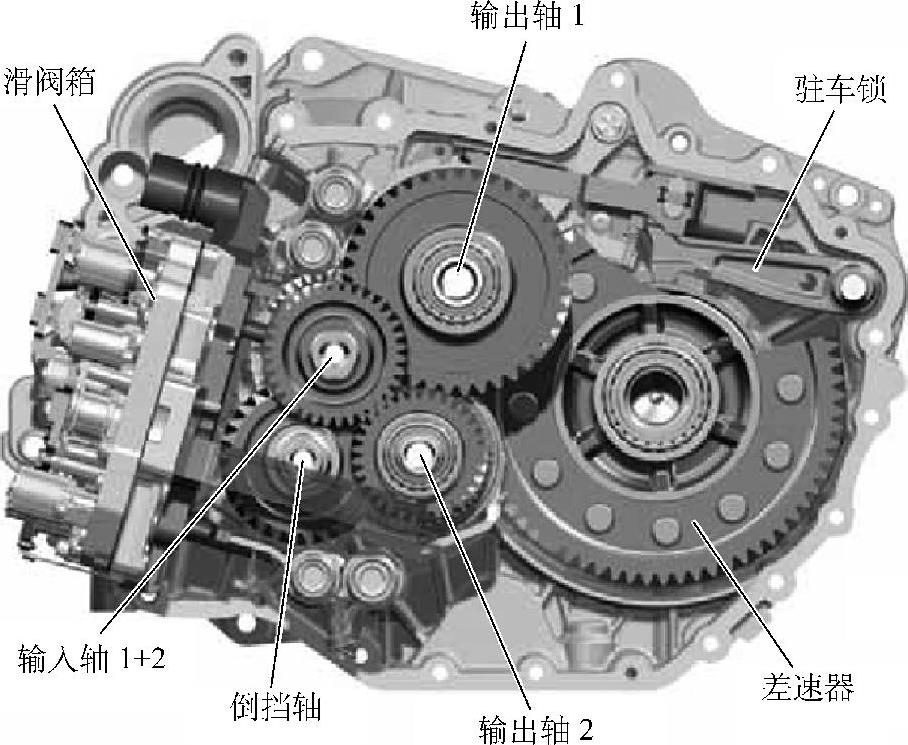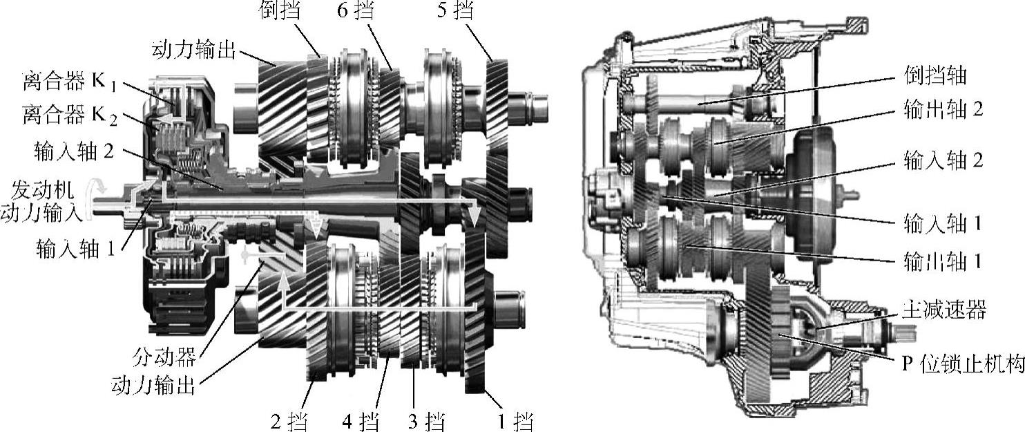 2)DSG内部机械系统构造如图2-15所示。发动机转矩通过离合器输入变速器内部,在变速器中通过输入、输出轴及齿轮啮合形成动力传递并将转矩输出到驱动桥。
