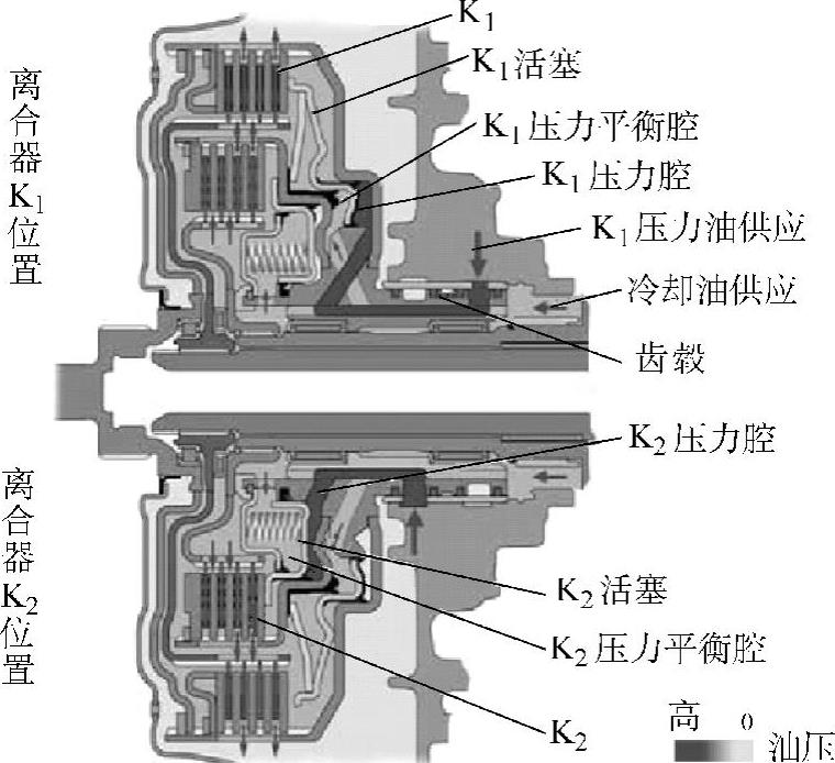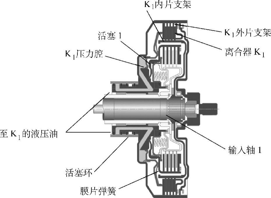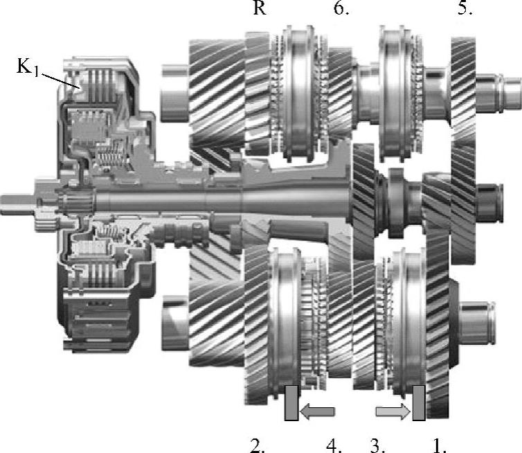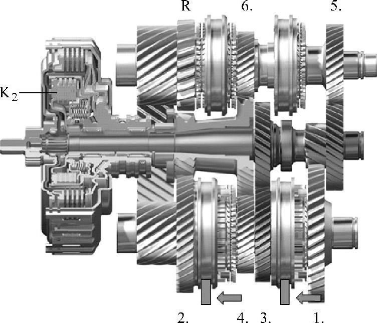 1)双离合结构如图2-11所示,离合器供油路线如图2-12所示。在离合器工作时,活塞1充油,活塞移动将离合器K 1 内外片压合,从而转矩通过离合器外壳→离合器K 1 片→输入轴1,活塞1泄油后,离合器K 1 分离,碟形弹簧将活塞退回,转矩传递中断,在离合器K 1 分离的同时,活塞2开始充油,活塞移动将离合器K 2 内外片压合,从而转矩通过离合器外壳→离合器K 2 片→输入轴2,这样始终有一个离合器处于接合状态。离合器K 1 负责将转矩传递给输入轴1,输入轴1用来完成1、3、5、R挡,如图2-13所示;离合器K 2 负责将转矩传递给输入轴2,输入轴2用来完成2、4、6挡,如图2-14所示。发动机旋转使油液产生离心力,离心力作用使离合器接合过程中所需的压力增加,为了使离合器接合更加顺利,必须对由离心力引起的压力进行补偿。离合器K 1 的碟形弹簧与活塞1和K 2 外片支架形成空腔,K 2 回位弹簧固定片与活塞2之间也形成空腔,往两个空腔内充油,利用油液在发动机高速旋转过程中离心力作用下产生的平衡油压来进行补偿。