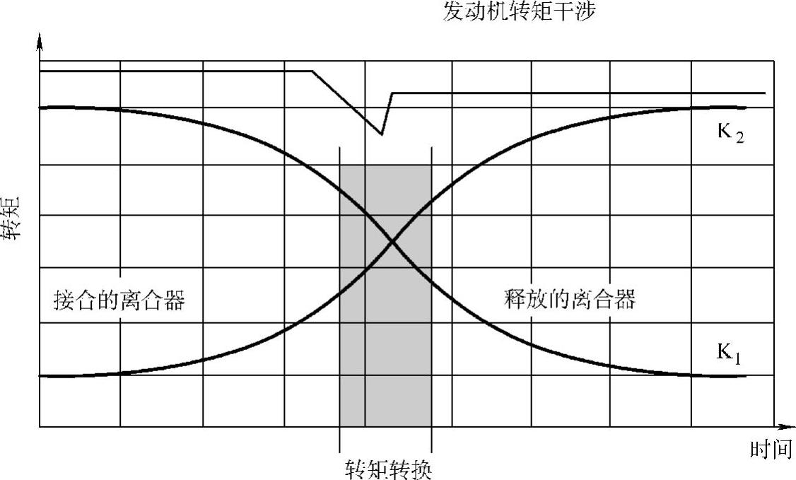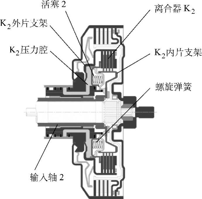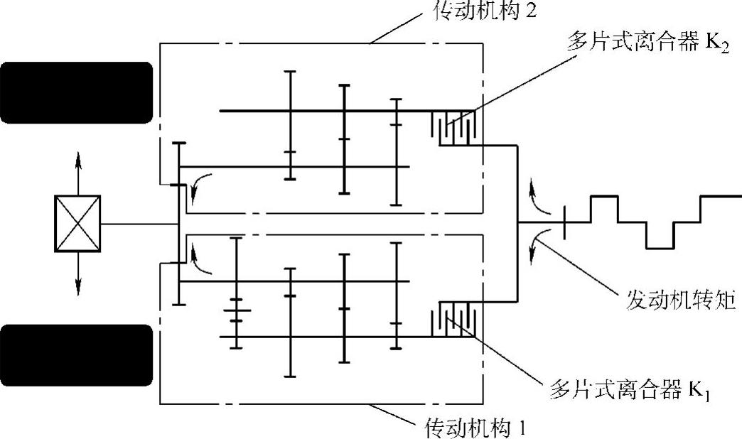 1)发动机转矩经离合器K 1 和K 2 传递给输入轴1和输入轴2,如图2-19所示。