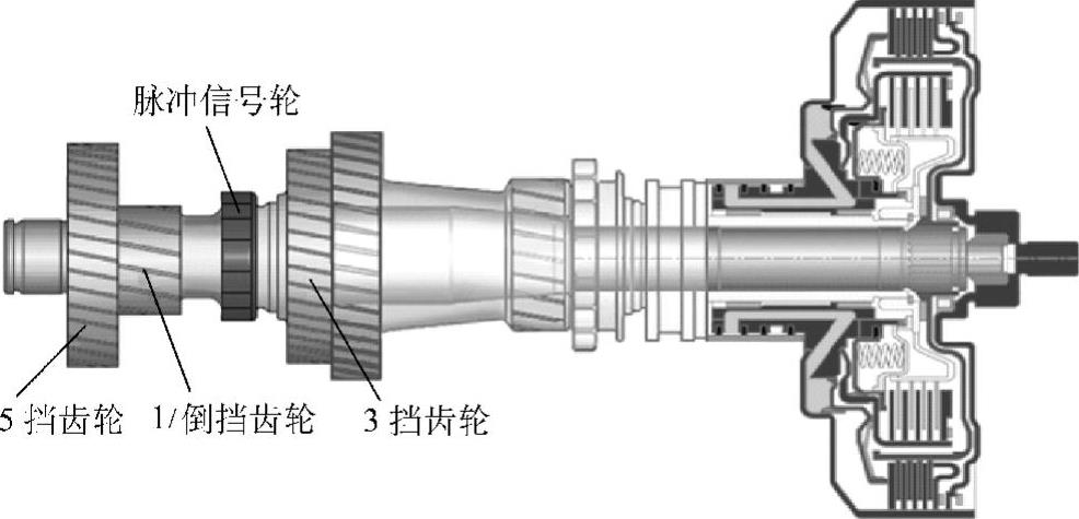 2)输入轴1。输入轴1在空心的输入轴2的内部,通过花键与离合器K 1 相连,输入轴1上有1挡/倒挡齿轮、3挡齿轮及5挡螺旋齿轮,在1挡和3挡齿轮之间还有输入轴1的转速传感器G501的脉冲信号轮(靶轮),如图2-20所示。