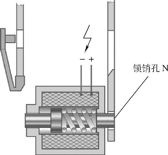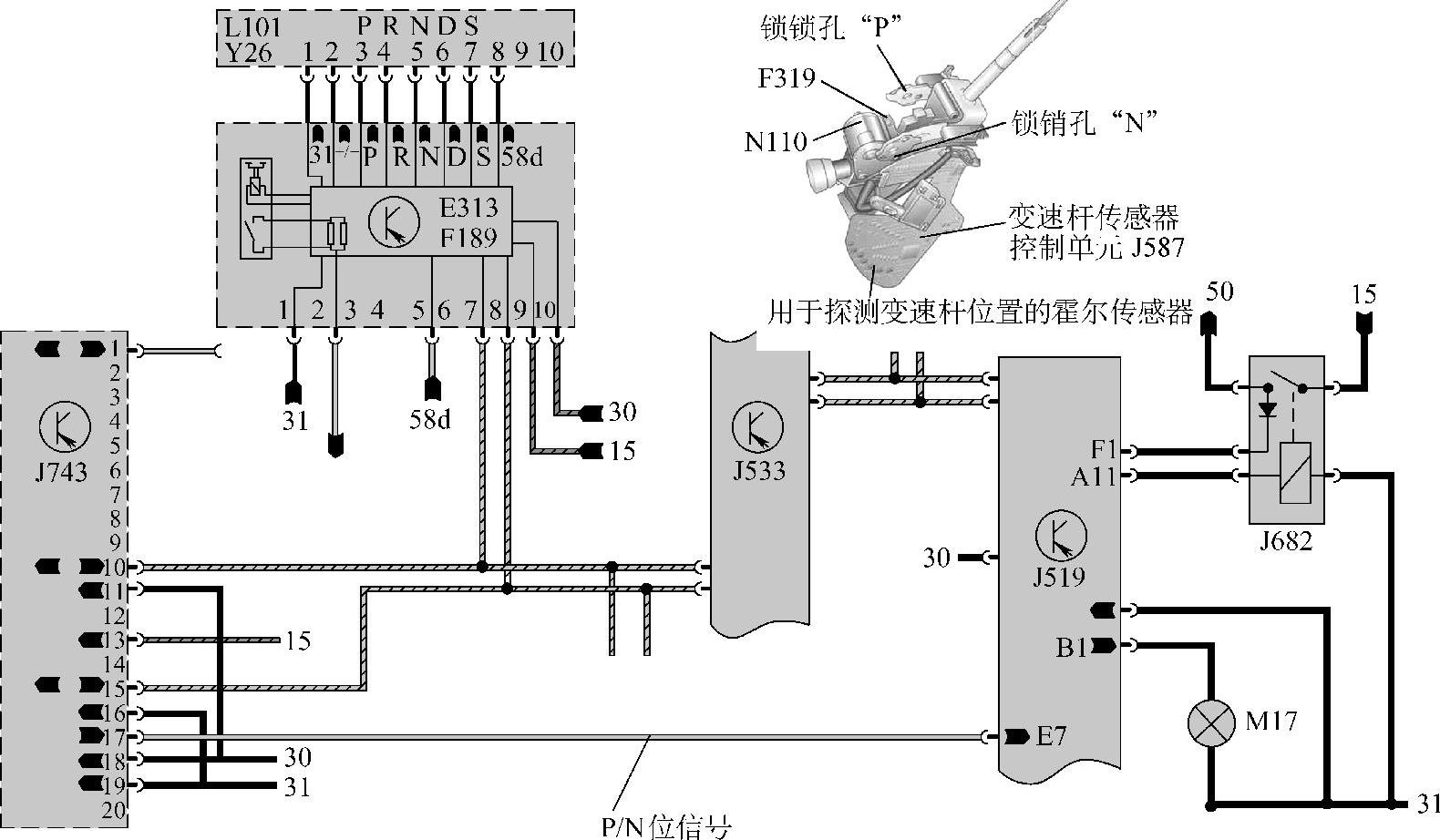 5)变速杆锁止在N位。如果变速杆位于N位的时间超过2s,控制单元将向电磁铁供电。这样即可将锁销推入锁孔内。变速杆无法移动到其他挡位,踩下制动踏板踏板时锁销自动松开,如图2-6所示。