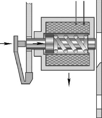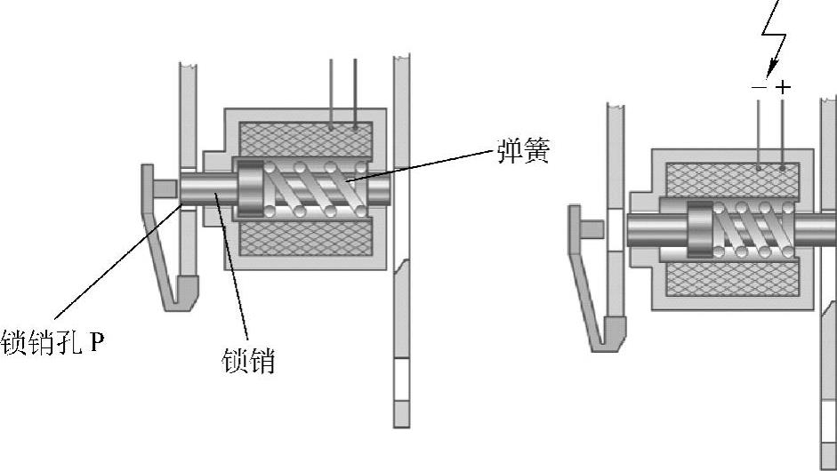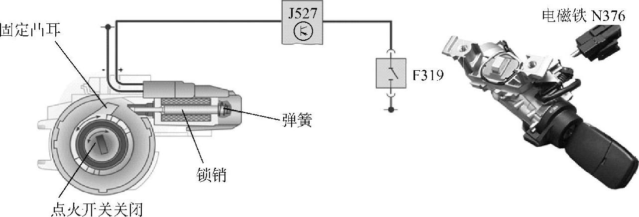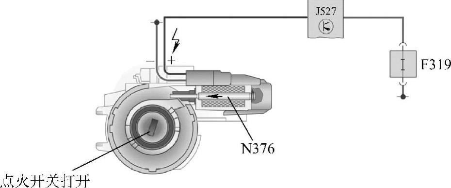 8)点火钥匙防拔出锁可以防止驻车锁未锁止时,点火钥匙转到拔出位置。按照电控机械原理,由转向柱控制单元J527控制,变速杆位于P,点火开关已关闭。变速杆位置开关F319打开,J527探测到此信号,则停止向电磁铁供电,电磁铁内的弹簧将锁销推到开锁位置,如图2-9所示。