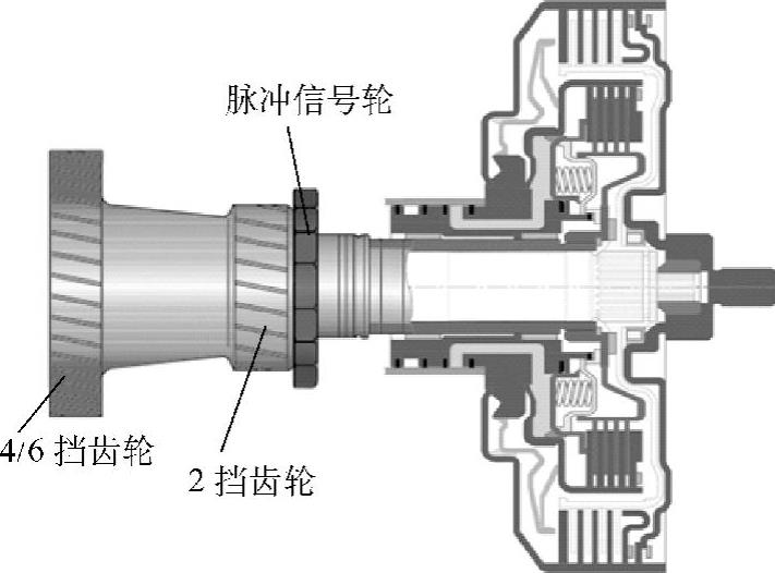 3)输入轴2。输入轴2为空心,套在输入轴1的外部,通过花键和离合器K 2 相连,输入轴2上有2挡、4挡/6挡齿轮,在2挡齿轮附近还有输入轴2的转速传感器G502的脉冲信号轮(靶轮),如图2-21所示。