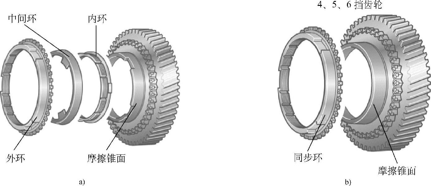1、2、3挡变速比大,因此采用三件式同步器如图2-26a所示;4、5、6挡变速比相对小,因此采用单件式同步器,如图2-26b所示。