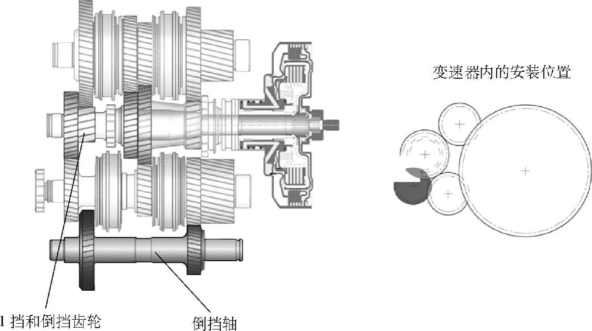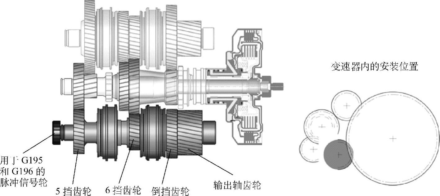 2)输出轴2(图2-23)。输出轴2上装有如下元件:变速器输出转速传感器靶轮,与差速器相连的输出轴齿轮,5挡,6挡和倒挡换挡齿轮。