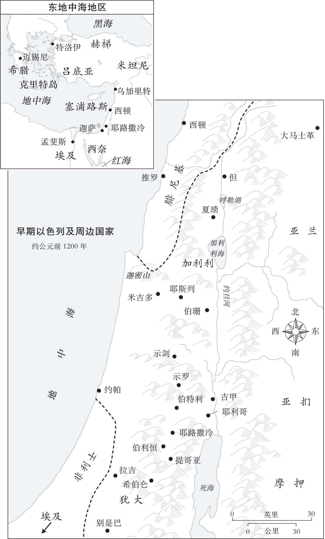 自公元前15世纪起成为埃及帝国一部分的沿海平原上的大型城邦,随着埃及的衰微而一个接一个地解体了——这个过程持续了一个多世纪。我们不知道为什么这些城市会在埃及人离开之后崩溃。也许那里爆发了城市精英与农民之间的冲突,农民们耕种的土地是当地经济发展所依赖的。也许城市里出现了动荡局面,或是随着埃及政权的衰落,各城邦之间处于敌对状态。但是这些城市的瓦解产生了一个重要的后果。在临近公元前1200年之时,一个新定居地的网络在高地建立起来,从北部地势稍低的加利利(Galilee)一直延伸到南部的贝尔谢巴(Beersheba)。