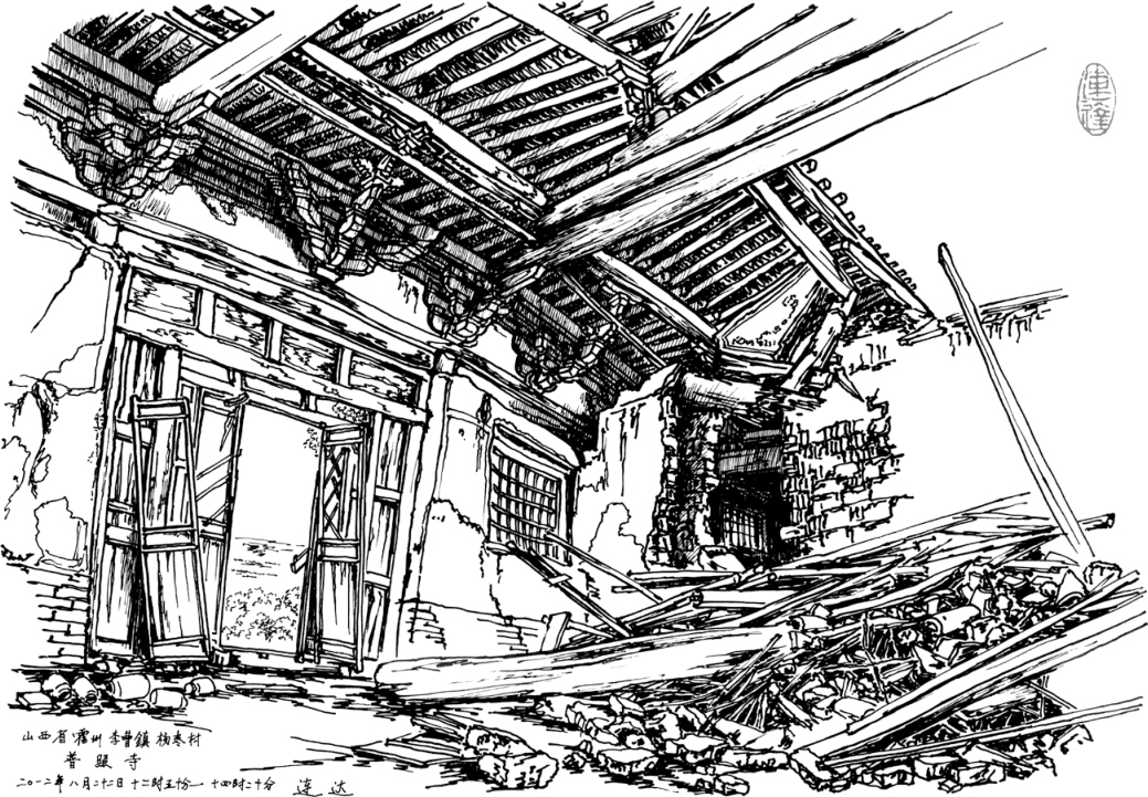 普照寺是一个坐北朝南的长方形院子,由山门、正殿和垛殿以及两侧的配殿、厢房组成。现存的山门为砖砌拱门,没有门楼,看起来更像是乡下的普通民居。上面镶乾隆甲寅年(1794)的石匾“普照寺”,门洞封闭已久,陷在杂草丛中。院中更是成了植物的乐园,夏日的野草灌木几乎填满了院子的各个角落,不知道这里荒废了多久,草木已经尽情地疯长组成了一张大网,看起来既松软又深不可测。院子东西两侧的配殿和厢房几乎全部坍塌,仅剩下一些残缺的山墙凄凄惨惨地还在强撑着。最北端有一座至少两米多高的大平台,上面的正殿和东西垛殿一字排开,如今平台前部已经坍塌,露出里面的夯土来,好像黄土断崖一般。正殿面阔三间,进深六椽,悬山顶,体量巨大,两侧垛殿则很矮小。正殿已经极度残破,右半部几乎全部垮塌,仅正面墙体和前檐前部尚在,檐下硕大的斗栱和门窗也基本完整,所以从正面看似乎还没那么惊人。殿宇左半部相对完整,但因为右边的坍塌使构架扭曲变形,导致剩余的屋顶和墙体也好似随时要崩塌一般。正脊的扶梁签上清晰地写着“大明永乐二年(1404)岁次甲申季冬十一日吉时建……”东边墙壁上还残存着一些明代的佛本生故事壁画,但境况实在是太惨了。这里应该曾被改造成工厂,在墙壁上随便扒出了门窗,还涂刷了“安全生产”之类的标语。在这一切破坏下勉强幸存的壁画很显然又遭到了窃贼的盗割,有几大块墙皮都被方方正正地切掉揭走,尚存者也被渗漏的雨水冲刷得泥痕密布,残缺不全。