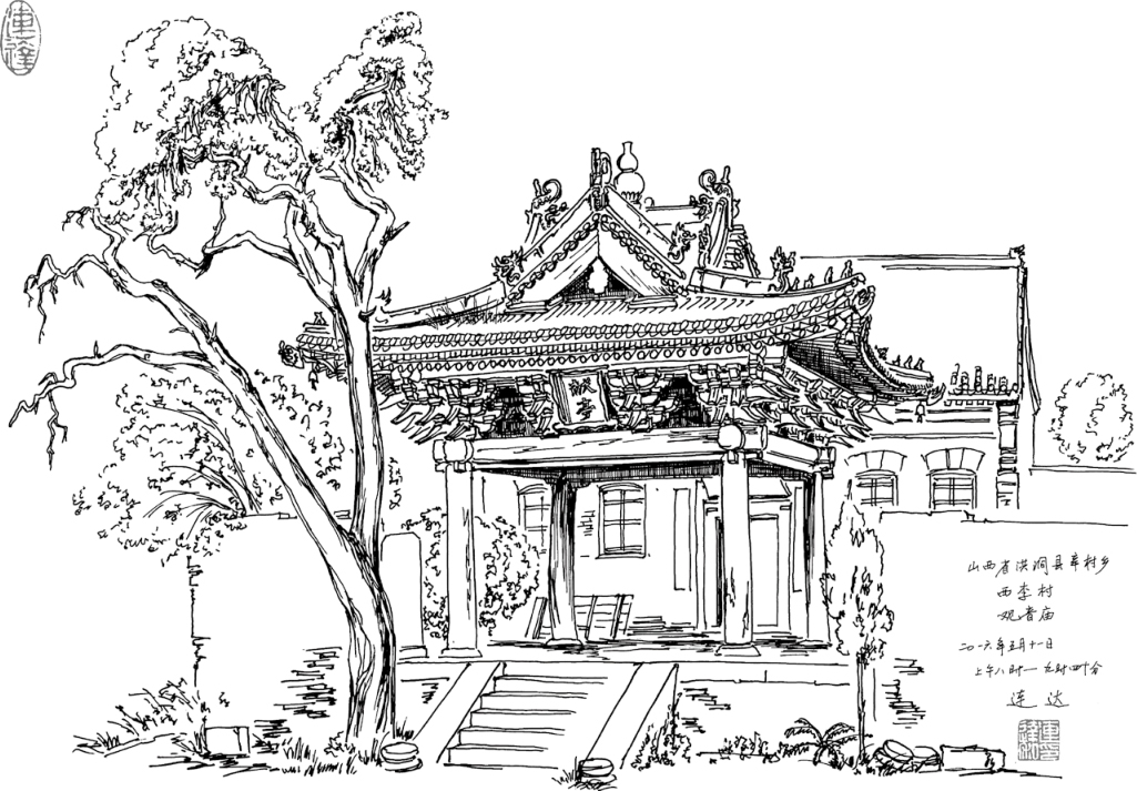 朝阳温暖地照在背上,让我像田里的秧苗一样不断地抻着懒腰,感到浑身都舒坦极了,伴着斜对面老乡们叮叮当当盖新房的嘈杂之声,我将观音庙此时的样子描绘记录了下来。