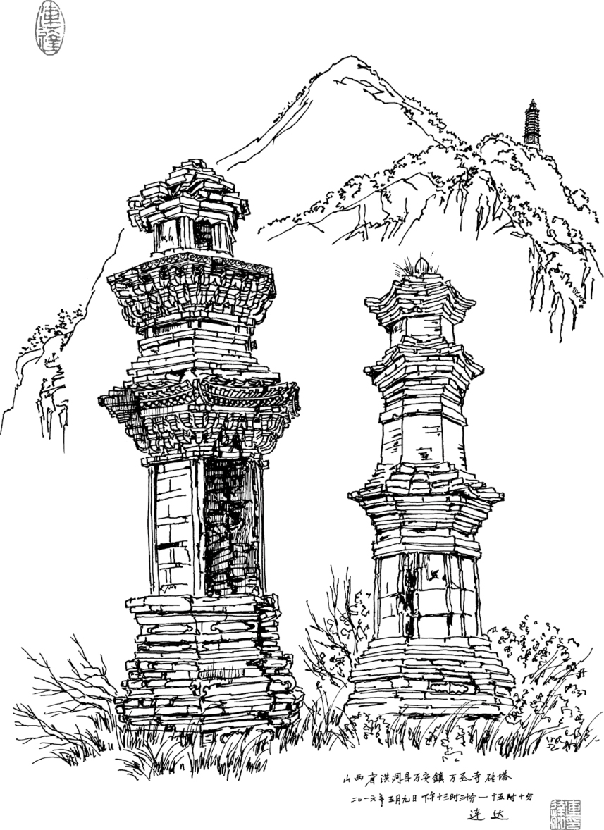 我在荆棘丛中缓步寻觅,却再也找不到这千年塔林其它的遗迹了,于是就地坐下来,以带斗栱的砖塔为近景,北山顶上的舍利塔为远景画了起来,但又觉得画面有些空,于是转身把三空禅师塔也画了进来。千年古刹的遗存屈指可数,坐在潮湿的草丛中,望着北山顶上的舍利塔就好像在遥望远去的时空,似乎真实又近乎于幻象,山脚下轰鸣驶过的大货车毫不客气地把我从沉思中唤醒,让我意识到,寻古探幽,感知历史,还要继续前行。