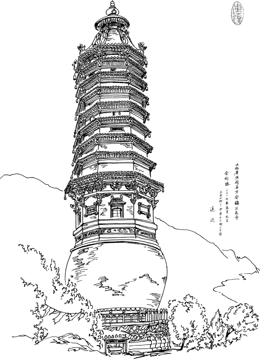 我背着沉重的大背包爬上北山,中途先路过了残存两孔砖窑的北台玄帝阁,这里除了石碑,一切都被捣毁了。当我沿着盘山土路来到山顶,已经是汗流浃背,但仰望舍利塔,仍然感到一阵兴奋。宝塔好似擎天一柱,借苍茫的山势更显挺拔俊秀。我翘首东望,想在天边寻找广胜寺飞虹塔的身影,我相信古人建塔之时,一定是能够东西呼应的,可灰蒙蒙的雾霾笼罩在天际,什么也看不清晰。平静一下,我开始准备画画,最后选在了塔南边的山崖尽头,背靠深渊,边啃着宗瀛师傅送给我的干粮边画,还要时刻提醒自己不要大意,坐稳了不能乱动,这才画成了舍利塔。