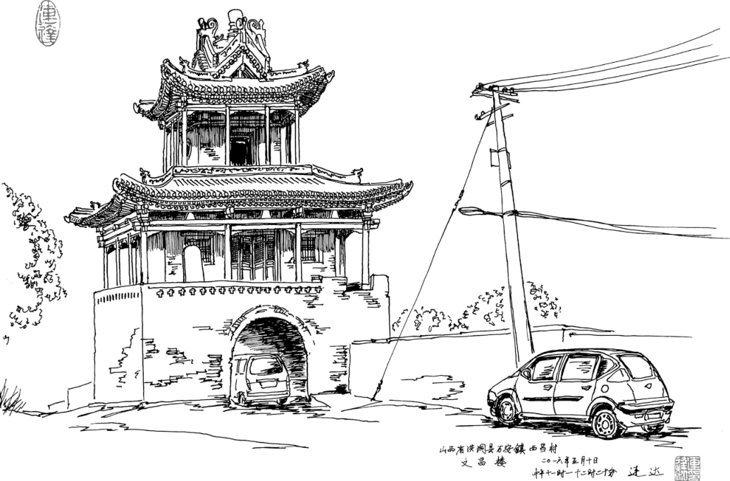 在路边画这座文昌楼近于尾声时,渐有几个本村老乡围拢过来观看询问。一个大叔表示可以开车送我出山回县城,不要一分钱,我正要感谢,他又说我画的这些画送给他一些即可。我只能回绝了他的好意,毕竟我千里来此,是为了给古建画像而不是为了坐车的,画都送掉,不就白来了嘛。顶着正午的烈日,勒紧饥肠辘辘的肚子,我再次背起小山般的背囊向山外走去。待到返回浅沟村路口附近已是饥渴难耐,就近在小卖店买了袋糕点,边吃边沿着公路向东走,希望能拦到个顺路车。吃了一半我才发现,糕点背面长了一层灰黑色的霉菌。想想这山村中的小店几乎没什么人光顾,这些东西不知已经放了多久,我无奈地苦笑,只能祈祷千万不要拉肚子了。