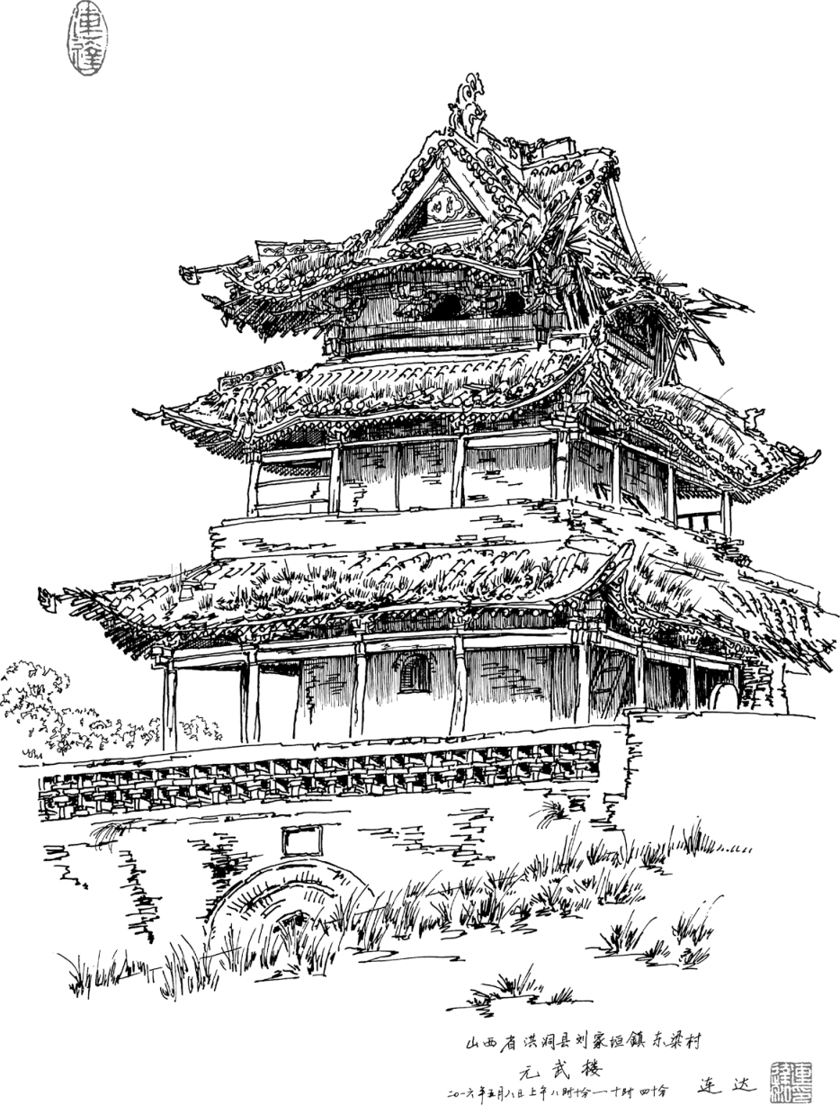 我趴在楼北的大铁门向内张望时,一个五十多岁的中年男人走过来,两眼充满了敌意的审视,并警告我不要靠近,想进去看看更是绝对没门。我顿时明白了,就如同以前多次经历的那样,我这个背着大包的外乡人被当成心怀不轨的盗贼了,而这个人则很可能是村中的领导。我见商量不成,无奈地退到附近开始画起来,他见轰不走我,就找了两个村民来盯着我,一个扛着锄头,一个拎着镰刀,轮流在我身旁转悠,甚至翻开我的背包检查里边到底装着什么东西,还名曰看我画画。为了画成元武楼,也就随他们便吧。后来画作初具规模,扛锄头的大叔也就不像之前那么如临大敌了。打开话匣子一聊我才知道,这楼内原有许多塑像,就在不久之前刚刚被窃贼把头都割走了,却根本无从追查,大家最近正气的不行,看见外地人就觉得可疑。而且这偏僻的村子平时根本就没有外来的人,所以我才被重点怀疑。