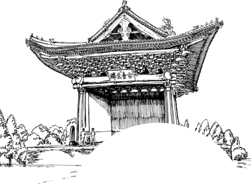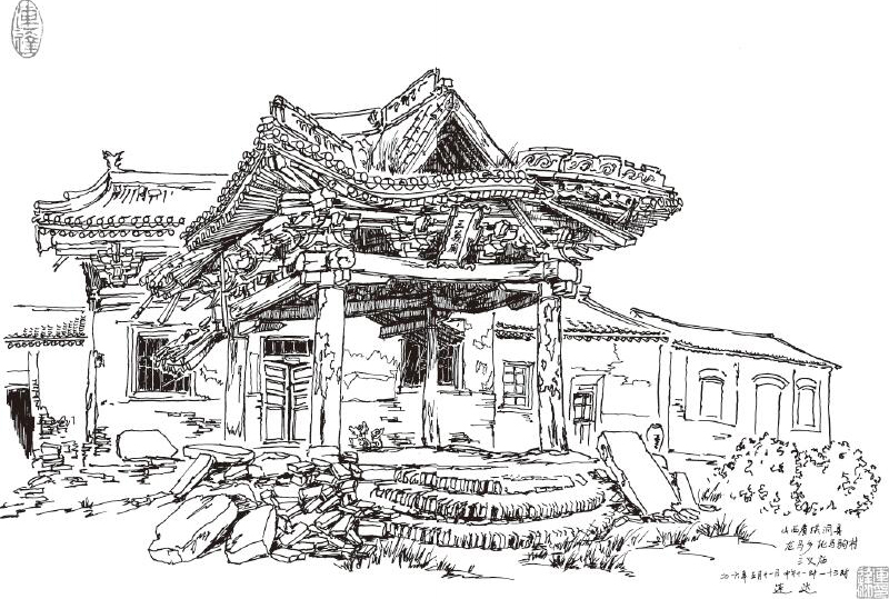 我坐在院内一株瘦高的槐树下可略躲避阳光的灼晒,但树上不时有小虫子掉落下来,甚至从领口直接掉进衣服里,真是防不胜防,无奈只好戴起伞帽继续坚持着,才把这幅三义庙完成。