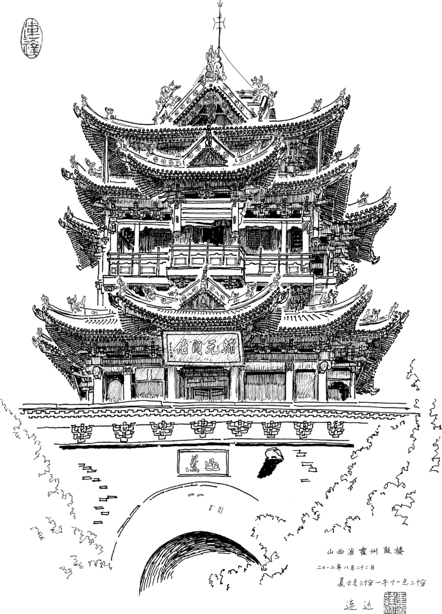 凭着历代的修缮维护和不错的运气,早已丧失了使用功能的鼓楼至今还被保留着,孤独地矗立于早已面貌不再的古城街心,沦为环岛里的城市景观。身旁纷繁嘈杂的汽车和行人川流不息,挺拔的鼓楼在四外水泥楼房的逼视下显露出一丝绝世独立的冷峻与孤傲,好似在用传统文化凝练出的华贵美好对那些简陋僵直的水泥房子进行着嘲讽,然而大家对这座美轮美奂的楼阁已经熟视无睹,甚至没什么人会对它驻足观看。我专程赶来霍州,第一时间就跑到鼓楼下,来看望这个首次谋面却毫无陌生感的朋友,将它的美好留驻于笔墨纸间,用以追思那逝去的千年古邑。