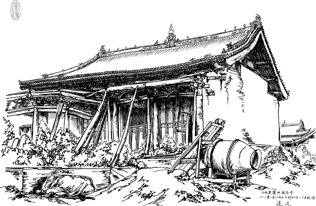 祝圣寺的正殿面阔五间,进深六椽,悬山顶,前檐下设与殿等宽的抱厦,建在一米多高的砖石台基上,正面还前出有宽大的月台,看起来应该是明代建筑。我来到这里时,正殿前的抱厦已经坍塌了,周围堆满了沙土和建筑材料,似乎正要进行一次大修。僧人很友好地带我从后门进殿参观,幽暗的殿内塑像黑漆漆如剪影般高耸在神台之上,充满了神秘的气氛。梁上的题记也根本看不清楚,一切都影影绰绰,仿佛进行着魔幻的探秘。