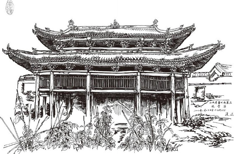 赵家庄观音庙相传创建于宋代,后来屡经修缮,延续至今者多为明清遗构,唯有一座元代楼阁时间最早。元代留存至今的建筑多为单体殿宇,楼阁则少之又少,此处尚有所存,堪称弥足珍贵。当我来到观音庙时,供人日常出入的西北角门紧锁,我向老乡打听,有人说也许管事的老汉过一会就回来了,也有的说他可能是下田干活了,晚上才回来。我正不知所措时,一个黑影忽地从我面前掠过掉在地上,吓了我一跳。定睛观瞧,原来是房顶上掉下来的蝙蝠。我一琢磨,这是好兆头啊,那就再等等看,于是沿着庙宇外墙向南走去,准备看看村景消磨一下时间。刚转到南墙边,一直在期待的元代楼阁陡然出现在眼前,给了我一个意外的惊喜。
