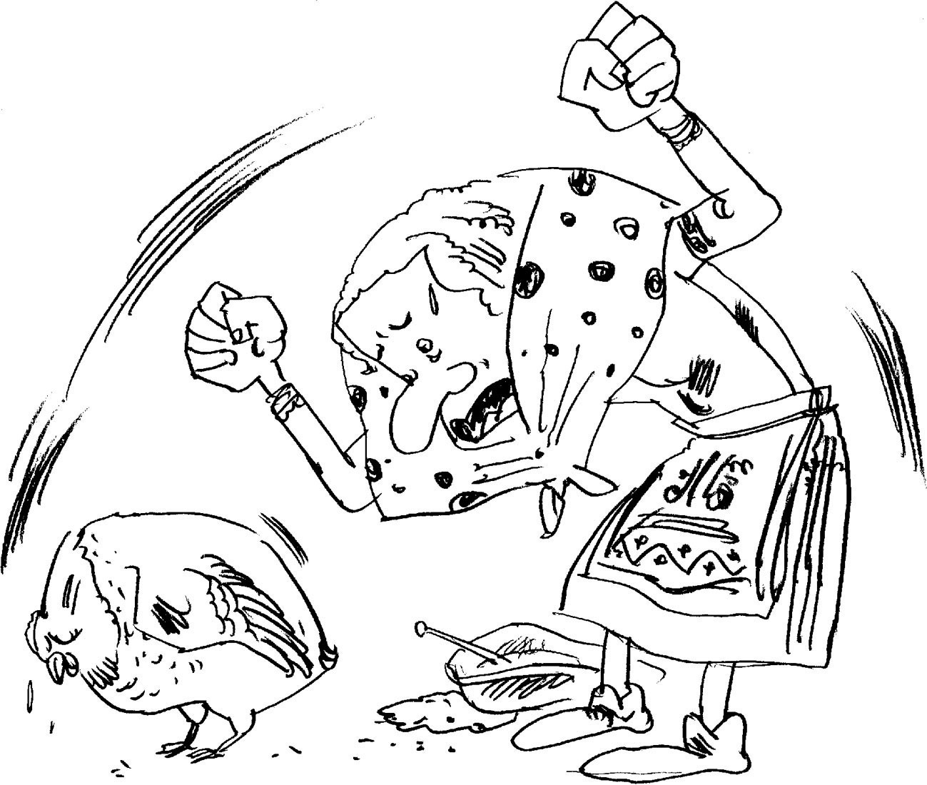 “天哪!天哪!我的母鸡下蛋啦!”寡妇喜出望外,抱起母鸡又是抚摸又是亲吻,吓得母鸡“咕咕咕”直叫唤。