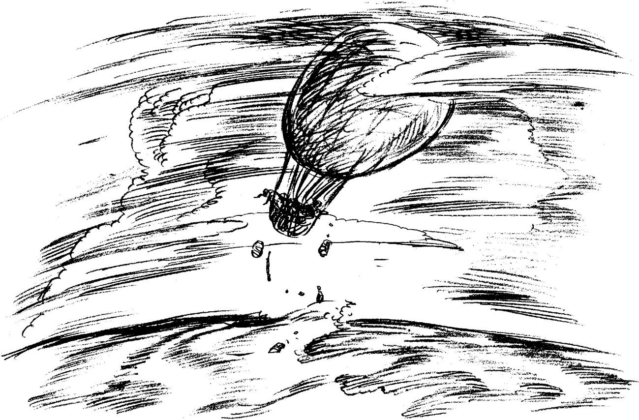 从3月24日清晨起,风势终于有了减弱的迹象,但气球再一次开始下降,这次比上次还要危险,因为气囊逐渐瘪了下去,硕大的气囊越拉越长,从球形变成了椭圆形。吊篮里五名乘客的心都提到了嗓子眼,他们把仅存的粮食、衣物甚至口袋里的小刀都扔掉了,仍然无济于事,气球还是不断地向下坠落。这时,五名乘客已经能看清吊篮下面辽阔的大海了。海水一望无际,海浪在狂风的带动下呼啸翻滚,让人不寒而栗。