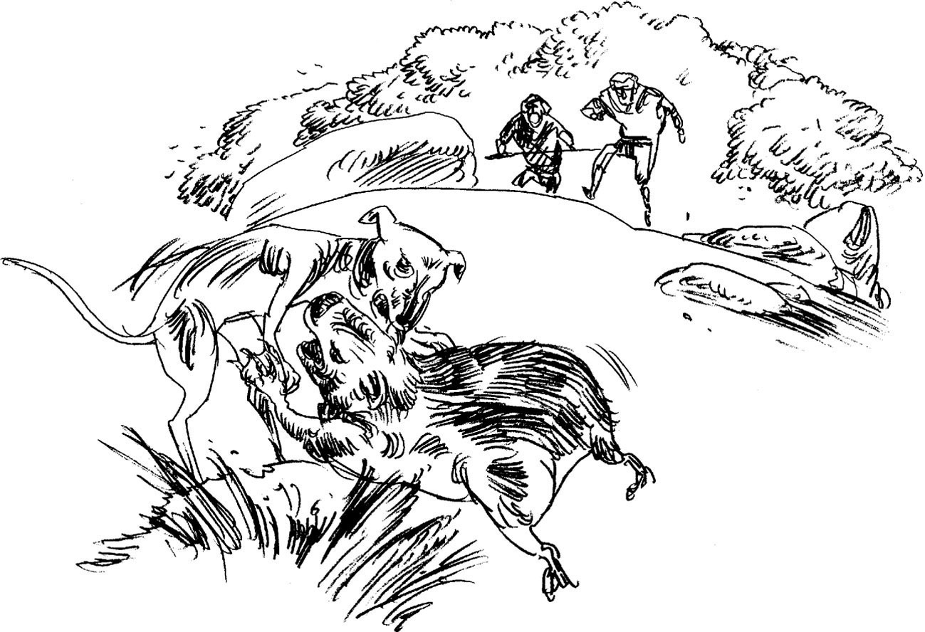 几个人走在山林里。赫伯特发现了一棵南欧松,树上的松子已经熟透了,味道很不错。过了一会儿,树林里突然传出托普的叫声。“看,托普找到什么了?”纳布边喊边往前跑,潘克洛夫和赫伯特紧跟在后。他们跑进灌木丛,看到托普正咬住一只两英尺长的野兽的耳朵,激烈搏斗着,这只野兽全身深褐色,毛稀疏而坚硬,趾间还有蹼,是水豚!
