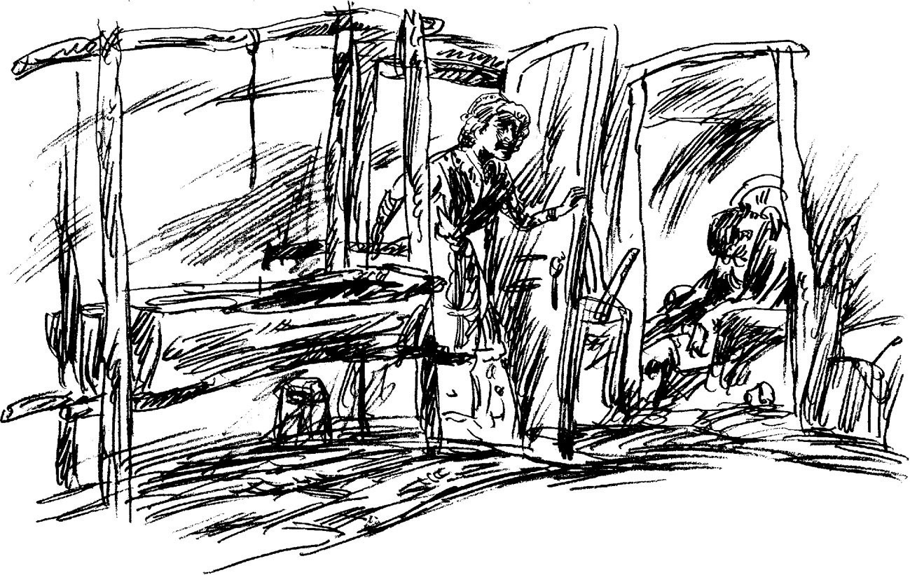 “女仆被吓得跑开了。跑到窗口,亨特已经打开窗户等着她了,每次饭菜都是从窗口递进来的。这时陌生人也跟过来了。