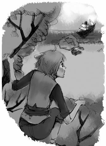 夜幕降临,我想到野兽多半在夜间出来觅食,更是忧心如焚。附近有一棵枝叶茂密的带刺的大树,我想爬上去坐一夜再说。我从海岸向里走了几十米,想找些淡水喝,居然给我找到了,真使我大喜过望。喝完水,又取了点烟叶充饥,我便爬上了那棵大树。我还用树枝做了一根短棍防身。由于疲劳过度,我立即睡着了,睡得又熟又香。