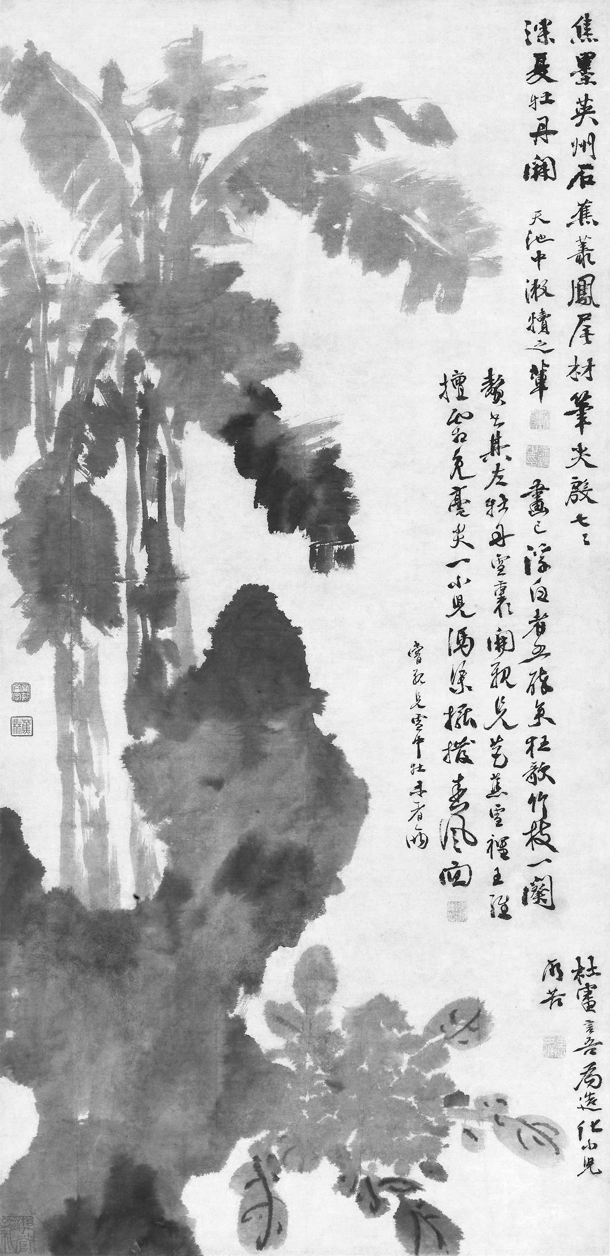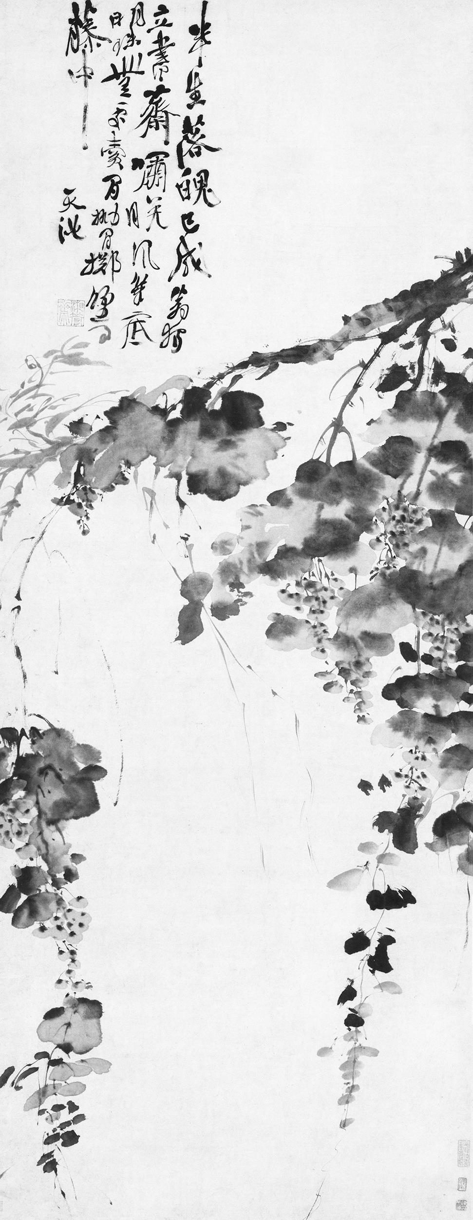 迫于生计等原因,徐渭中年以后才开始学画。他继承了梁楷减笔和林良、沈周、陈淳等的写意花卉画法,兼收各家之长而不为所限,大胆变革,极具创造力。其大写意画,无论是花卉还是花鸟,皆如疾风暴雨,一挥而就,一切尽在似与不似之间。对笔下的四时花木,画家运用勾、点、泼、皴等多种笔墨形态,将牡丹之雍容、紫薇之隽秀、竹子之萧疏、霜菊之孤傲、寒梅之高洁以及各种画材的神韵刻画得入木三分。挥洒舒展盈丈的梧桐和芭蕉直冲画外,不见首尾。落笔密如骤雨的葡萄、虬如蟠龙的藤蔓,满幅烟雨皆顷刻而就,构成了巨大的张力,充溢在画面中的纵横之气和豪放境界更是前所未有。