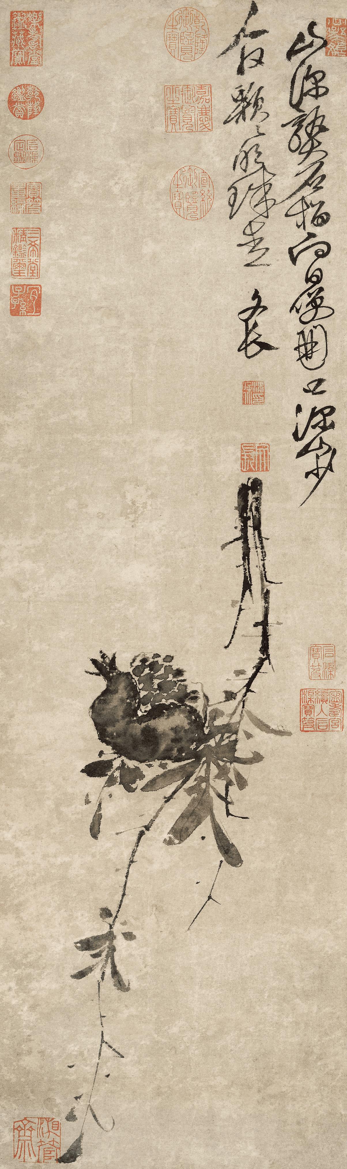 此为徐渭大写意花鸟画的代表作之一。大写意多为文人墨戏,颇显奔放、泼辣。徐渭在这幅画中用狂草题诗,书迹飞舞有势,画面用笔简劲,泼墨破墨互用,字画互相映衬,一气呵成。题诗内容和画面意境反映了他怀才不遇的心境。 5kPMAcH8vtIqS8F5Ls8gYmwiomiumw5vXblAn/nGEQG9MAwYAayysP/YdXAOlquH