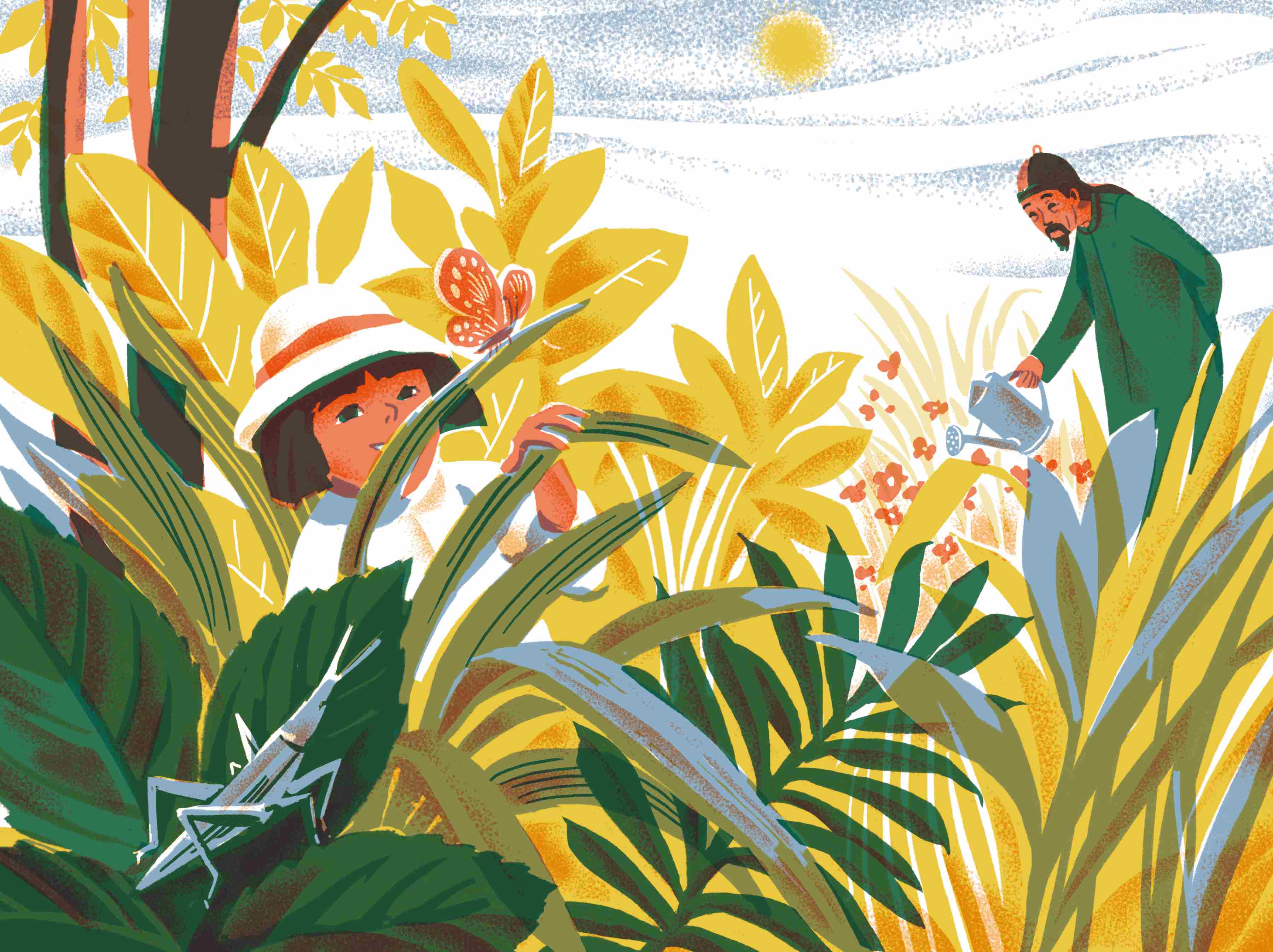 祖父一天都在后园里边,我也跟着祖父在后园里边。祖父戴一个大草帽,我戴一个小草帽,祖父栽花,我就栽花,祖父拔草,我就拔草。当祖父下种种小白菜的时候,我就跟在后边,把那下了种的土窝,用脚一个一个地溜平,哪里会溜得准,东一脚地,西一脚地瞎闹。有的把菜种不单没被土盖上,反而把菜子踢飞了。