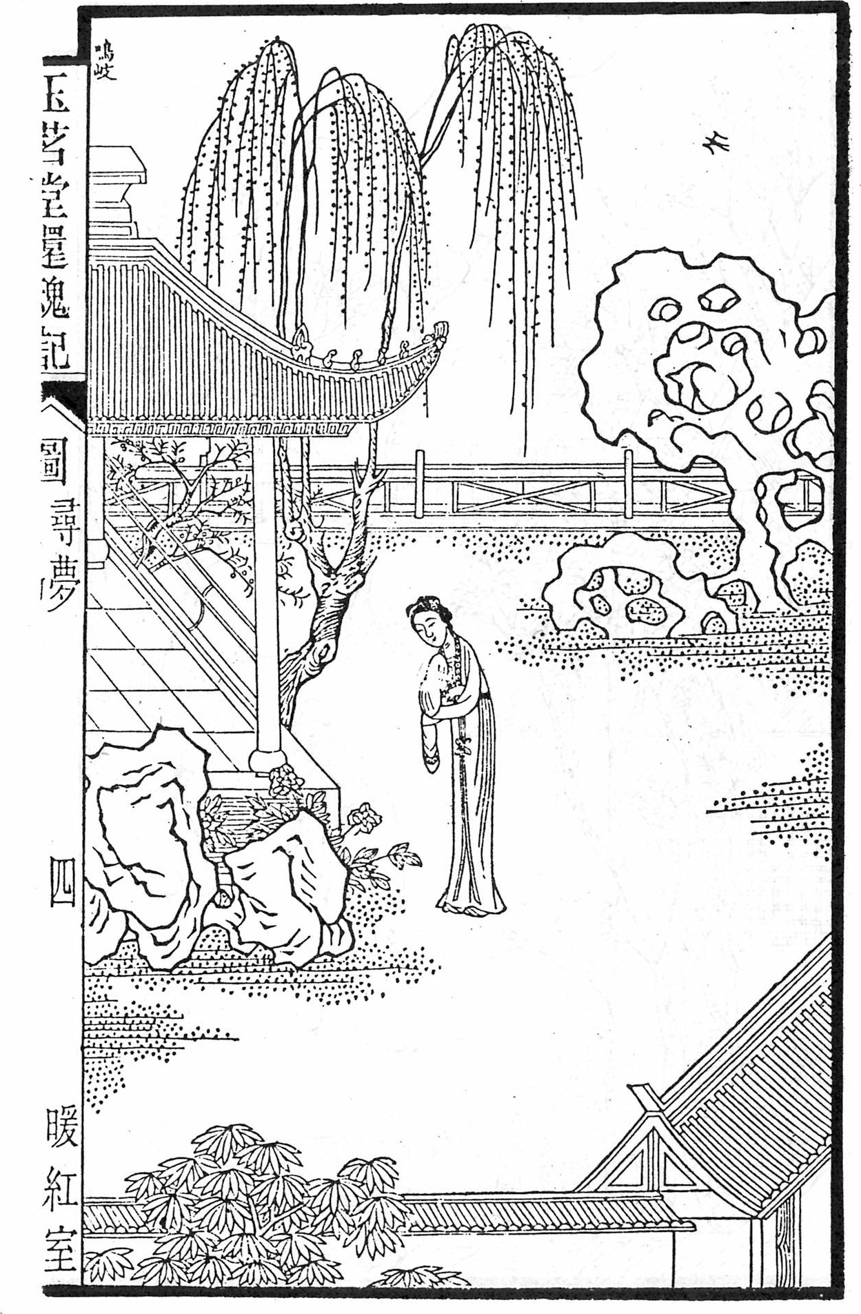 “忽忽花间起梦情,女儿心性未分明。无眠一夜灯明灭,怪煞梅香唤不醒。”昨日偶尔春游,何人见梦?绸缪顾盼,如遇平生。独坐思量,情殊怅恍。真个可怜人也! 〔闷介〕〔贴捧茶食上〕 “香饭盛来鹦鹉粒,清茶擎出鹧鸪斑。”小姐,早膳哩。 〔旦〕 咱有甚心情也!