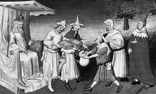 图1-2 “忽必烈接受威尼斯商人的礼物”(欧洲中世纪手稿彩图)
