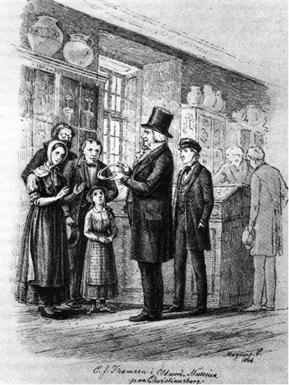 。汤姆森始终按此学说整理馆藏并著书立说,只要陈列开放就亲自到场为观众做讲解(见图1-9)。汤姆森是一个热心的讲解员,他向来参观的观众生动地谈论远古时代人们的日常经历,讲着讲着会在恰当时机把事先藏好的某件有趣的小东西(一件青铜器或一件铁器)突然拿出来,给观众一个惊喜,加深了观众的参观印象